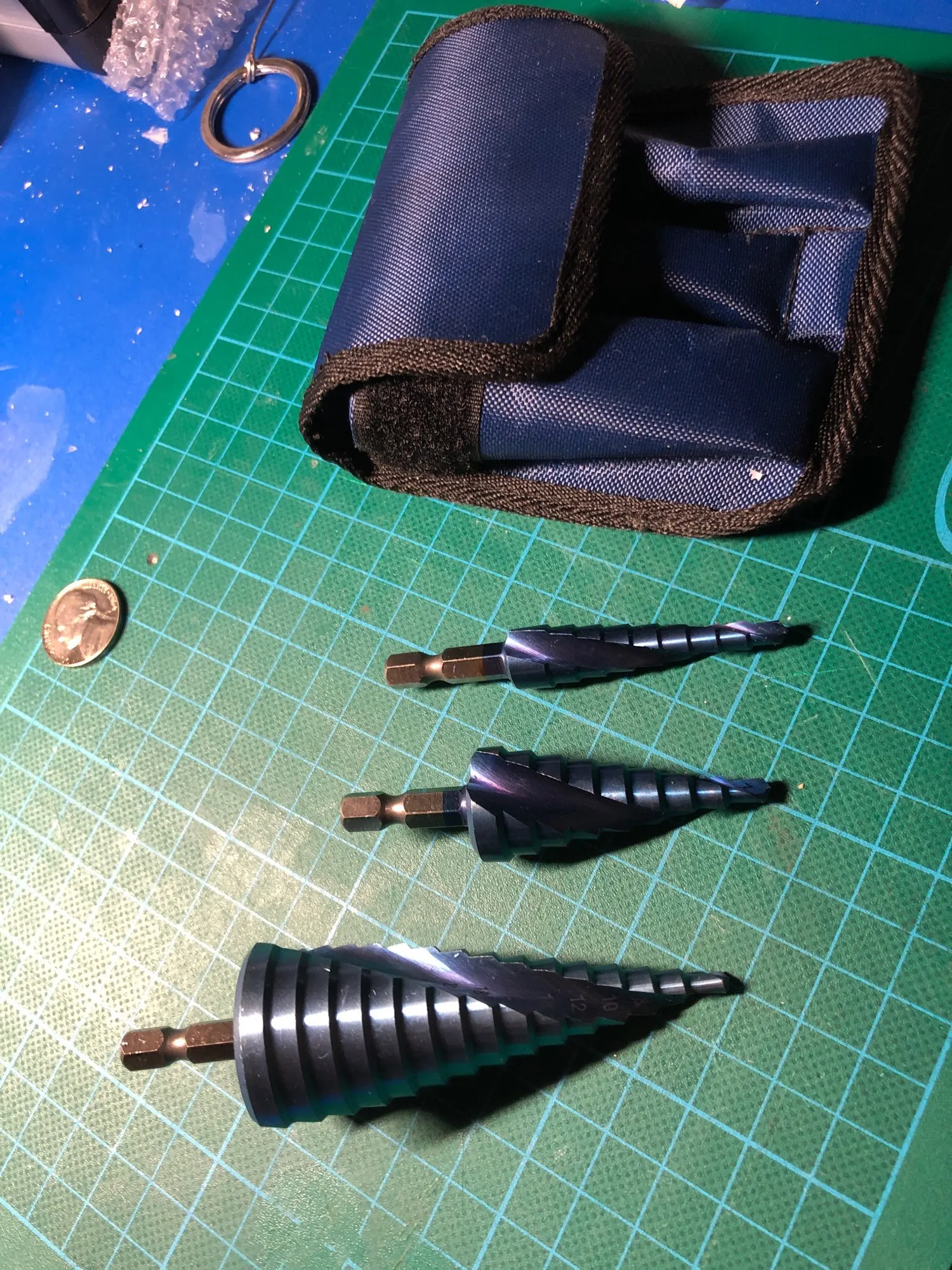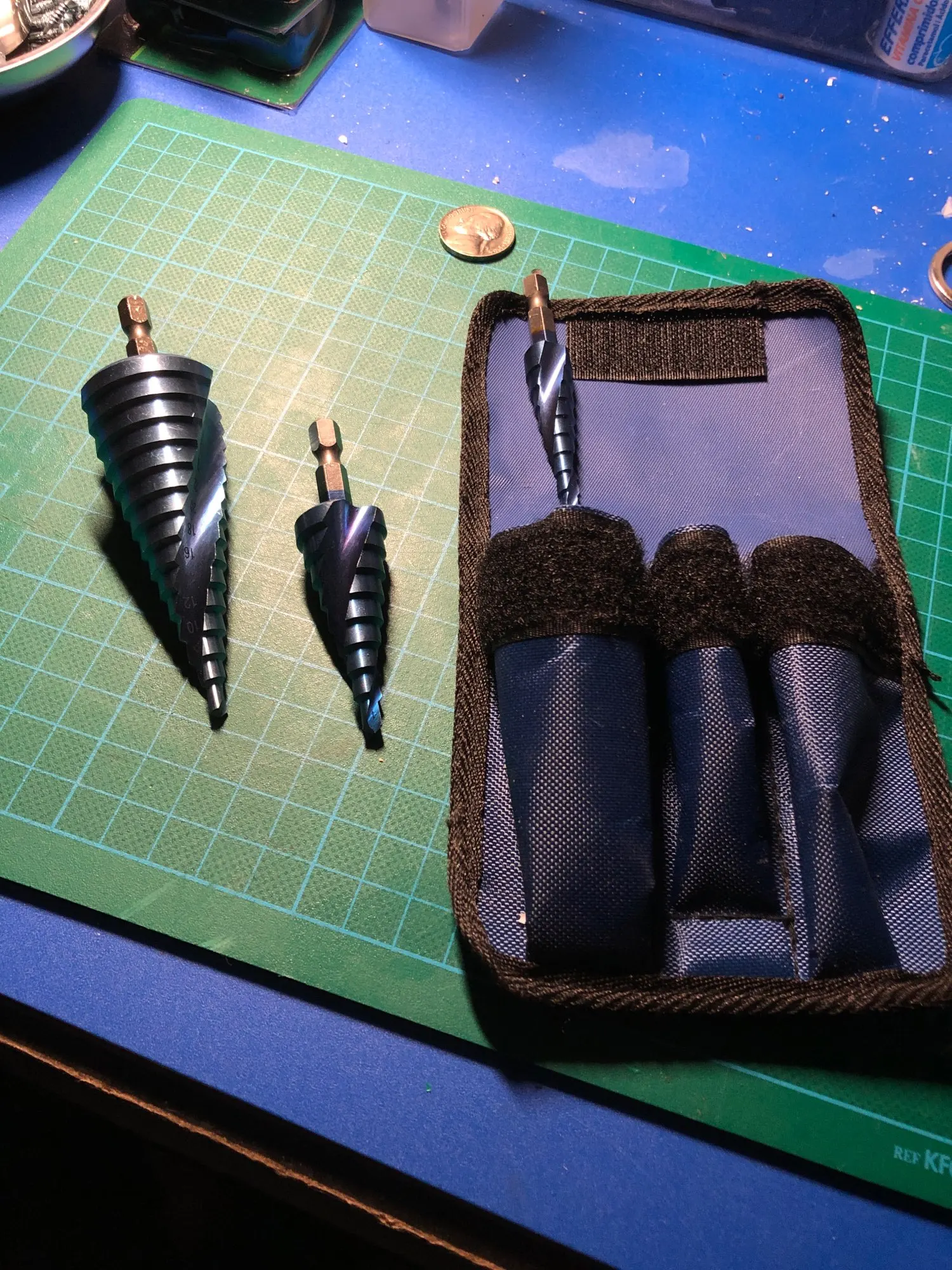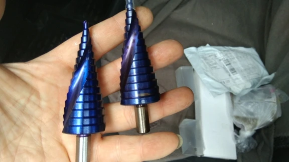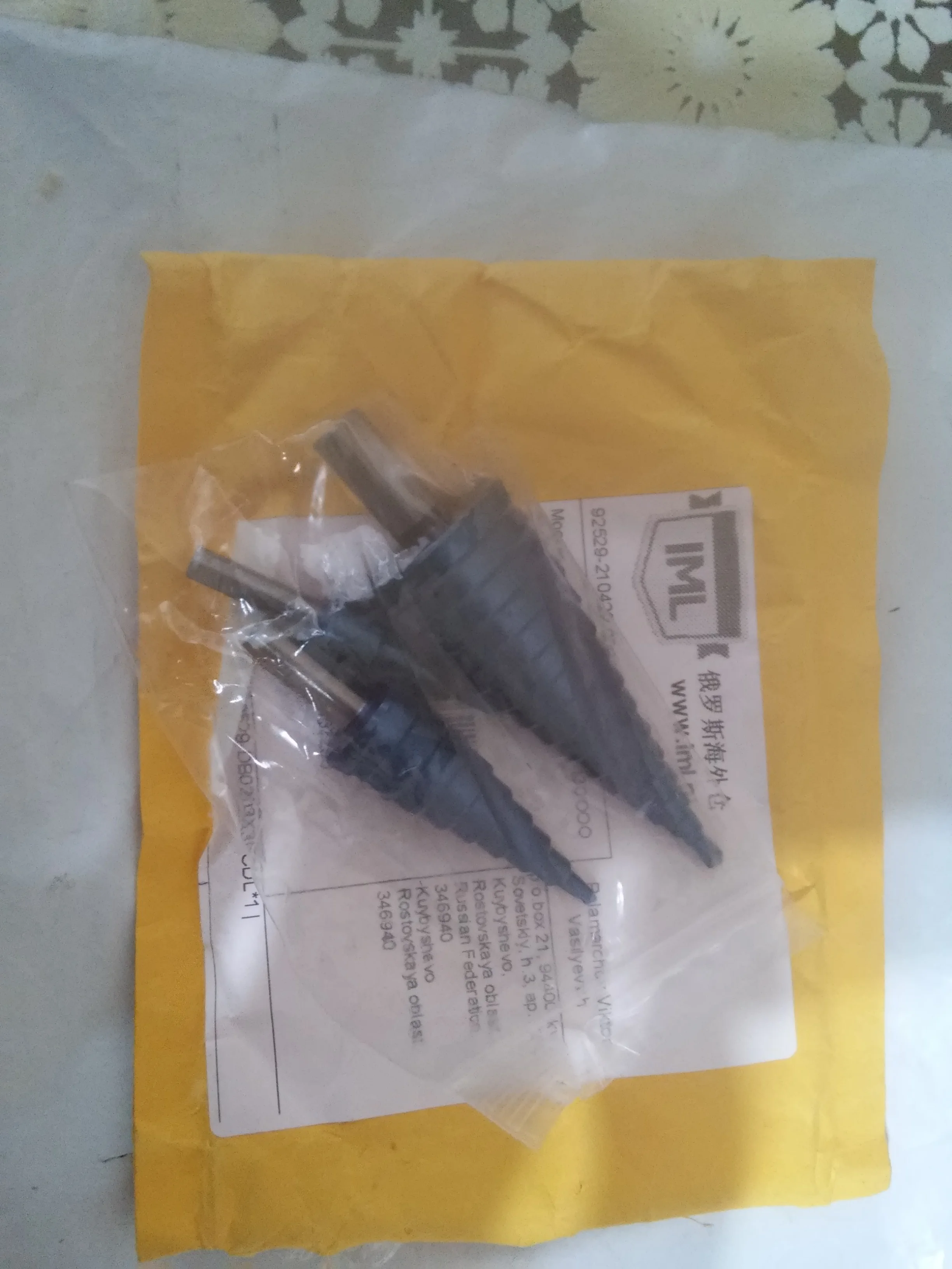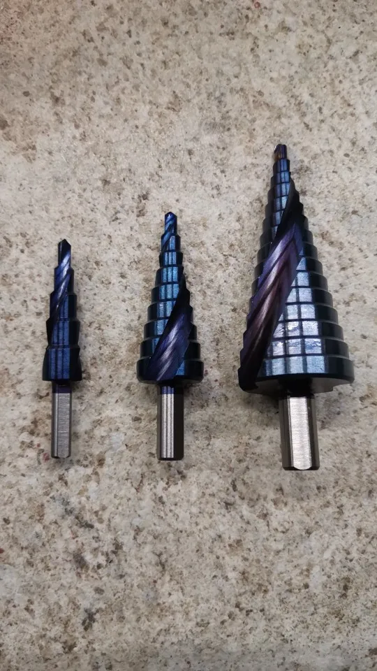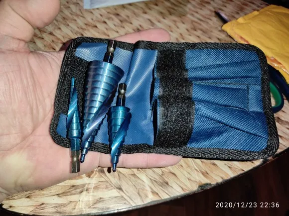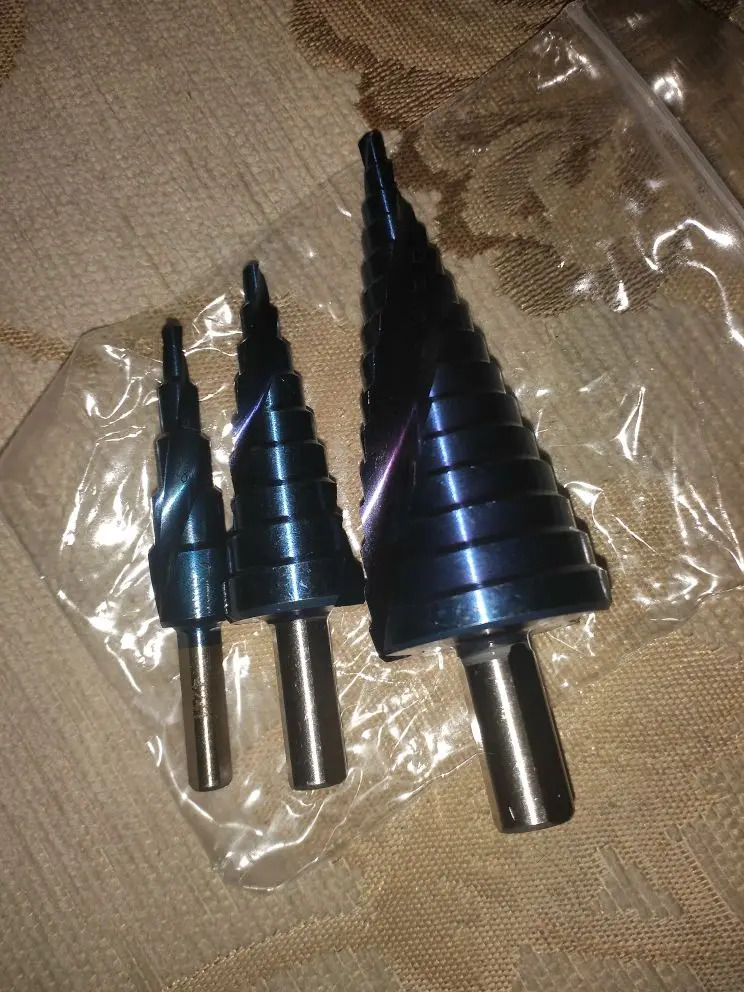 Набор конусных свёрл получил на практике пока не проверял,хвостовик под шестигранную биту и он тоньше чем на предыдущих сверлах,где хвостовик толще и с фасками под зажим в патрон.