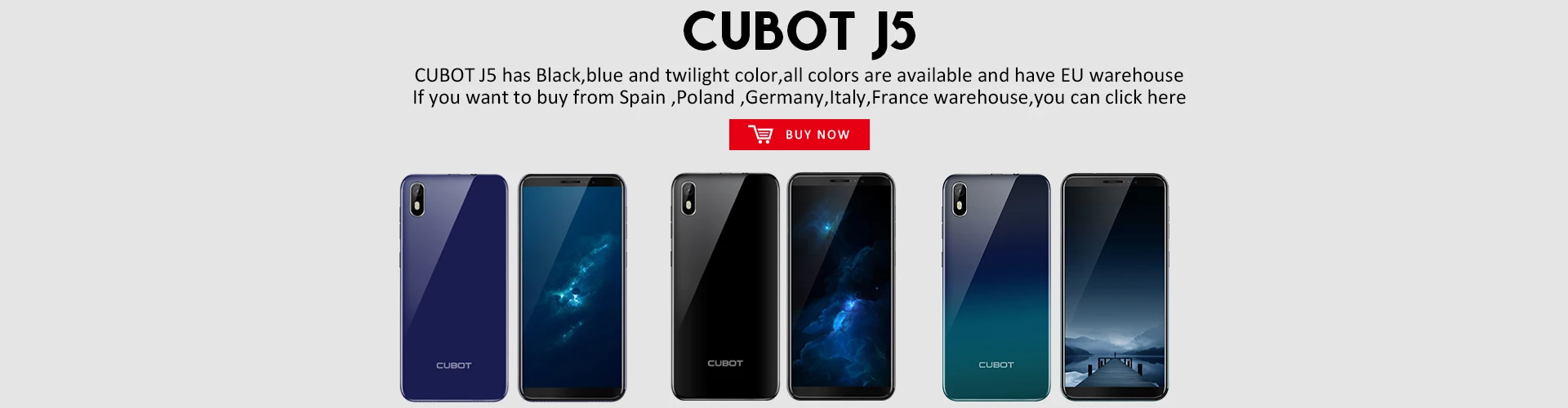 CUBOT J5 имеет черный, синий и сумеречный цвет, все цвета доступны и есть Европейский склад Если вы хотите купить из Испании, Польши, Германии, Италии, Франции, вы можете нажать здесь