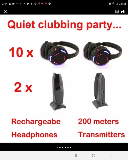 10.Можно добавить больше передатчиков для дополнительных каналов музыки (до 3), или дополнительных наушников для большего количества гостей (неограниченных). Все работает мгновенно-даже разные типы накладных наушников можно использовать вместе.