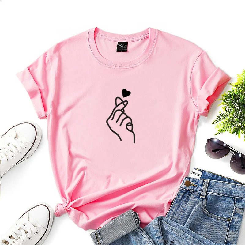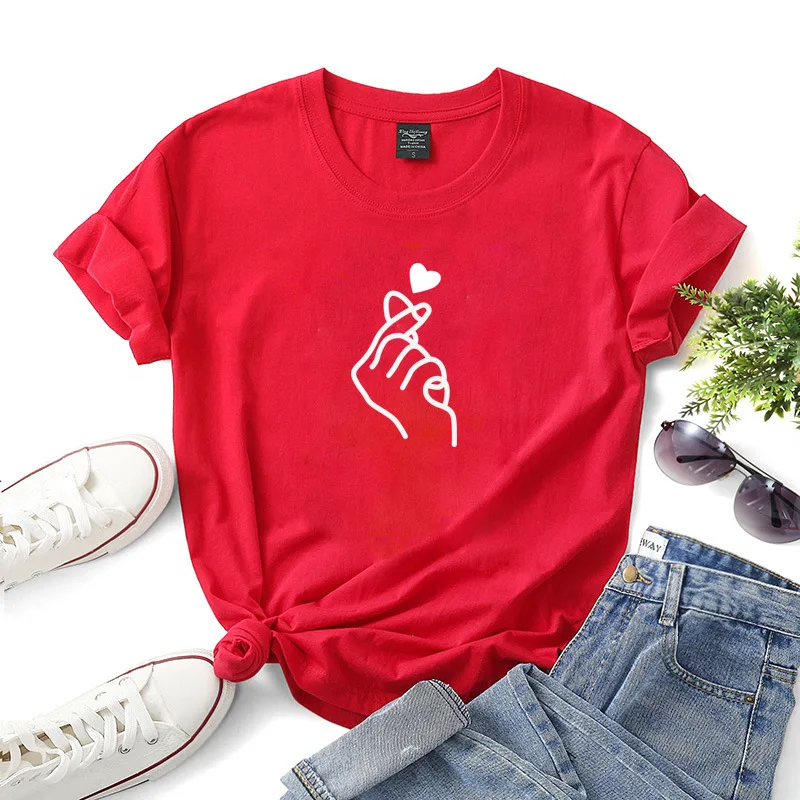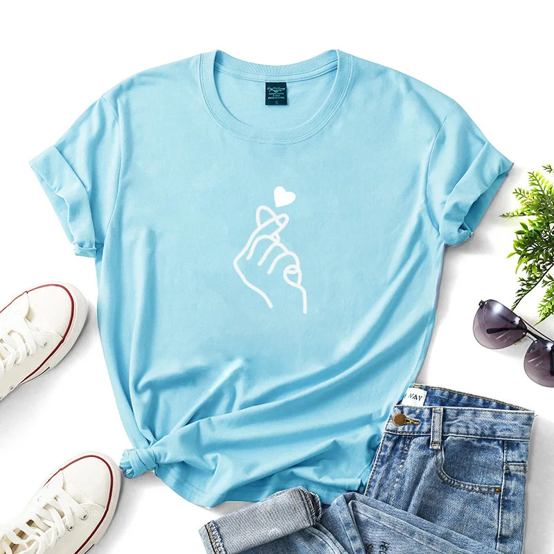 Палец Сердце печати Футболка Для женщин короткий рукав с круглым вырезом свободные футболки 2019 Лето Для женщин футболка топы Camisetas Mujer
