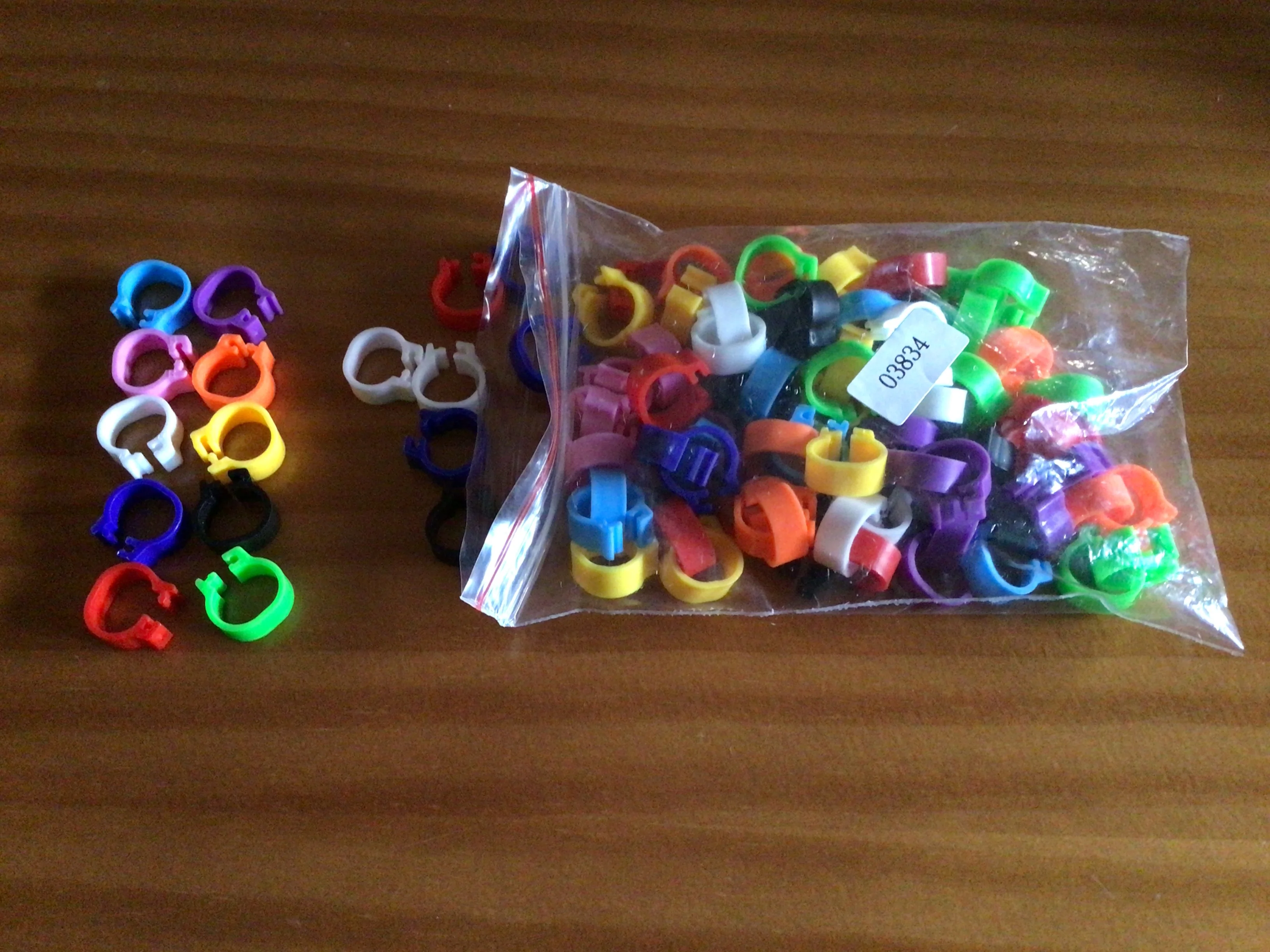 Кольца 8 мм внутреннего диаметра. Они поставляются в 4 сумках по 100 единиц в 10 цветах. Хорошее качество, чтобы открыть, надеть и также иметь возможность удалить ногу. Я использую их для растущих куриных куриц. Посылка доставлена за 10 дней.