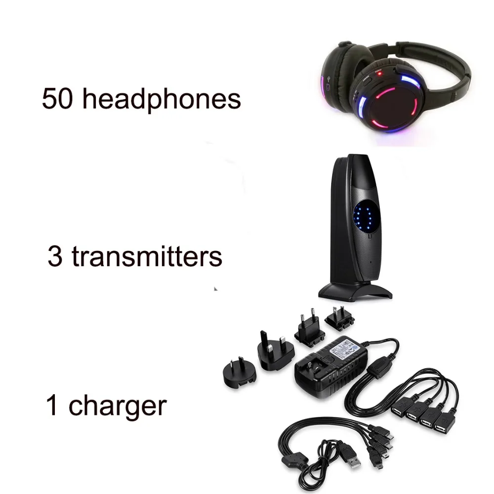 Профессиональные бесшумные диско-наушники-50 наушников с 3 передатчиками + 3 канала