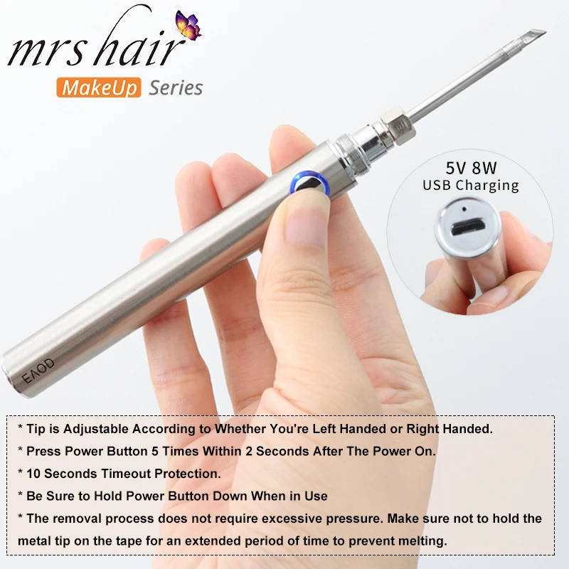 * Наконечник регулируется в зависимости от того, левша вы или правша.* Нажмите кнопку питания 5 раз в течение 2 секунд после включения питания.* 10 секунд защиты таймаута.* Обязательно удерживайте кнопку питания вниз при использовании* Процесс снятия не требует излишнего давления. Не удерживайте металлический наконечник на ленте в течение длительного периода времени, чтобы предотвратить плавление.