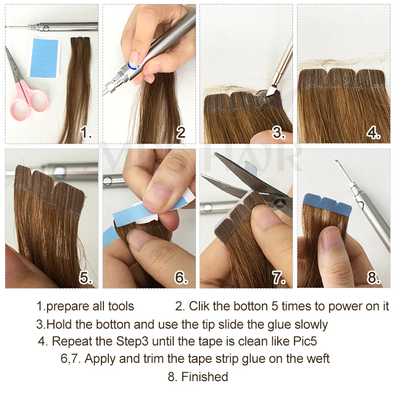 1. Подготовьте все инструменты.2. Кликните кнопку 5 раз, чтобы включить ее.3. Держите кнопку и медленно сдвиньте клей с помощью наконечника.4. Повторите шаг 3, пока лента не станет чистой, как Pic5.6,7. Нанесите и обрежьте ленту полоской клея на утке.8. Готово