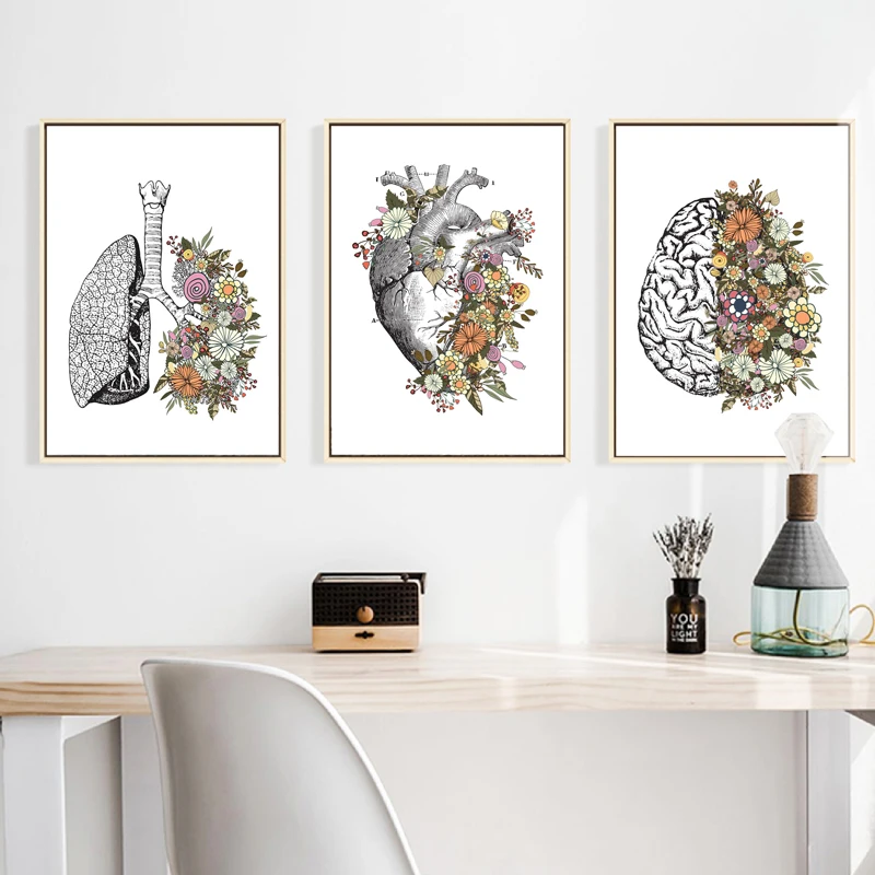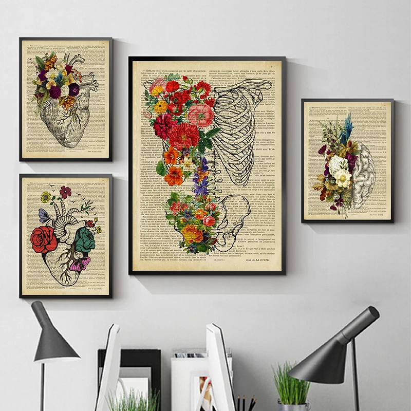 Винтажная анатомия, цветочное сердце, мозг, настенная Картина на холсте, ретро плакаты и принты, настенные картины, декор медицинской врачей клиники