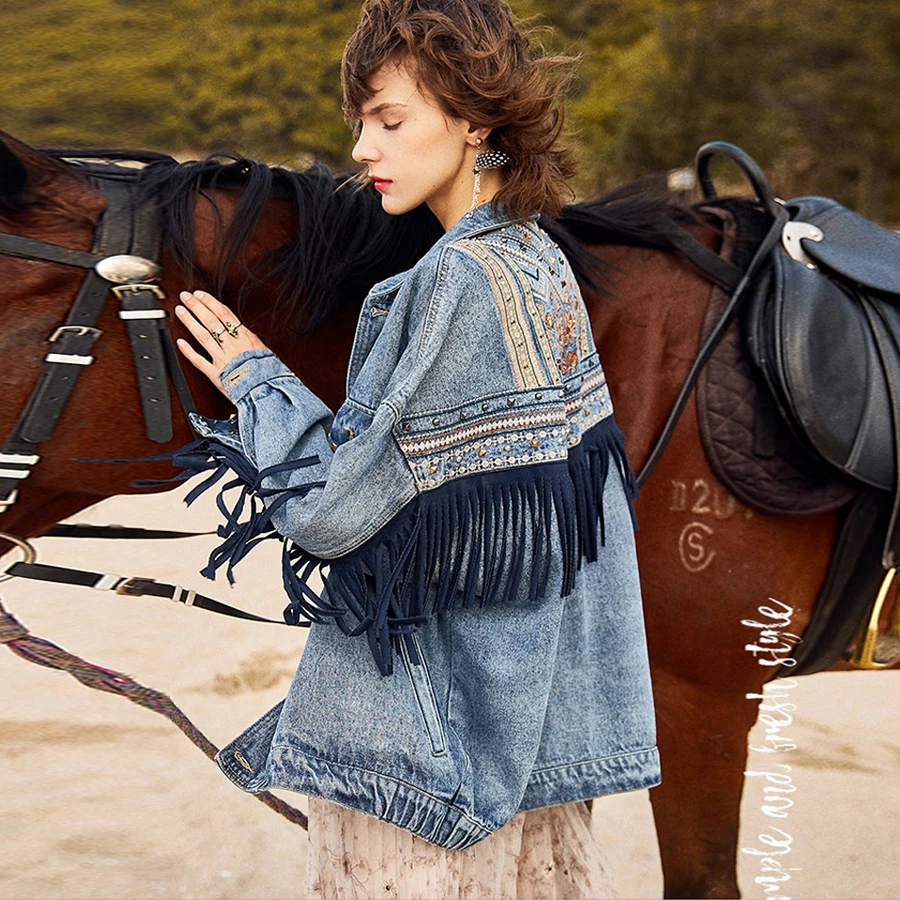 Женская джинсовая куртка с цветочной вышивкой, винтажная замшевая Свободная куртка с бахромой, верхняя одежда с длинным рукавом, пальто бохо