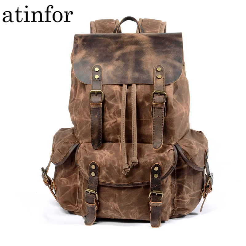 Водонепроницаемый рюкзак из вощеной ткани и натуральной кожи для мужчин, винтажный дорожный ранец на шнурке, сумка для ноутбука с большой вместимостью