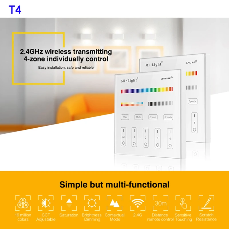 Название продукта: 4 зоны RGB + CCT Smart ПанельПульт дистанционного управленияНомер модели:T4Рабочая температура: -20 -60 ℃Напряжение: AC90 ~ 110V или AC180 ~ 240VЧастота передачи: 2400-2483,5 МГцМетод модуляции: GFSKМощность передачи: 6 дБмРасстояние управления: 30 мРазмер панели: 86*86 мм