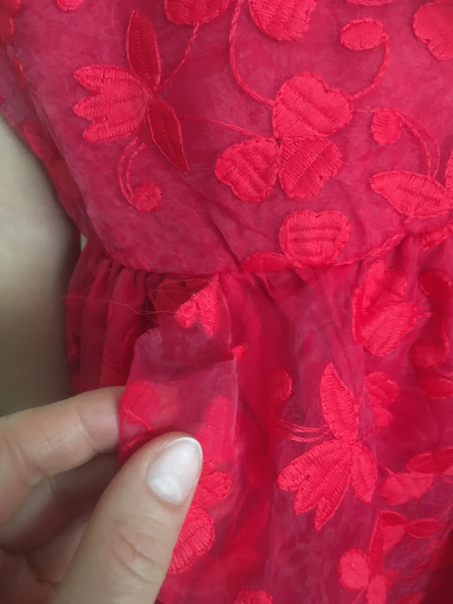 Платье красное с бантиком, просто супер! Лёгкое, нежное. Подклад хлопок, сверху сетка, дырок нет. На пухленькую девочку 2г размер 4. Спасибо!