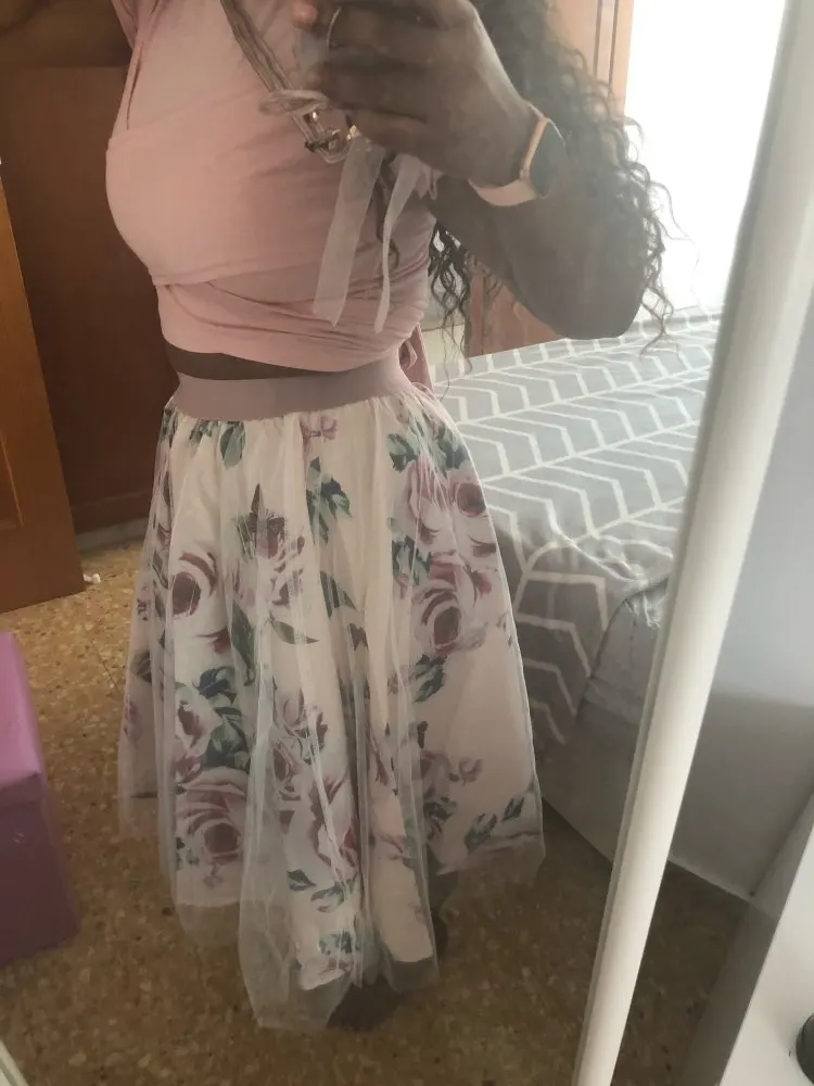 Выглядит так красиво, как на картинке. Материал хорошего качества, юбка хорошо сидит и выглядит потрясающе. Как правило, я ношу размер 38, wziedloam L и прекрасно ложится. Что касается цены, очень рекомендую этот комплект, стоит того.