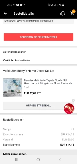 Обои шли четыре месяца. Сначало пришли через месяц абсолютно не то что заказывали, по два листа два разных заказа( 4 листа) ещё и с пятнами. Написали продавцу, он выслал повторно, ждали три месяца, очень долго и неприятно. Но в целом обои хорошего качества, красивые, продавец общительный и доброжелательный. Его вины нет, это склад так отвратительно работает