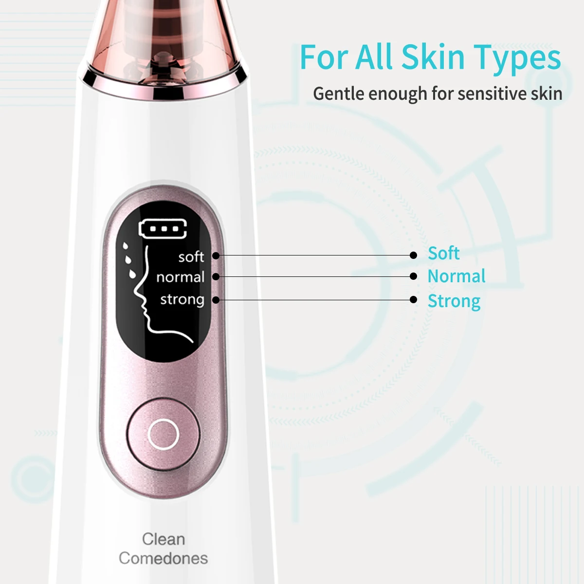 Регулируемый Угри экстрактор:Оснащен тремя присосками для регулировки: мягкий, нормальный, сильный, таким образом, очищающее средство для пор подходит для нескольких типов кожи.