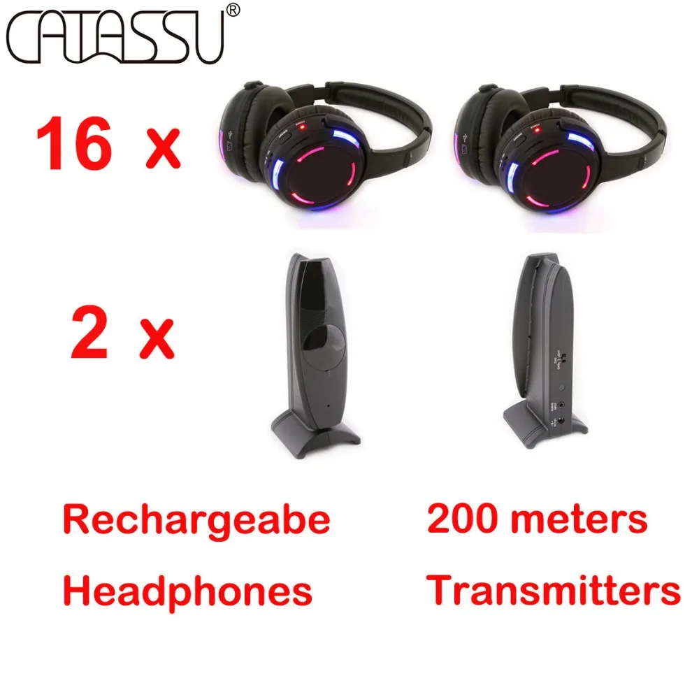 Наушники Сайлент диско наушники-16 шт. светодиодный Перезаряжаемые RF Беспроводной наушники с 2 передатчика