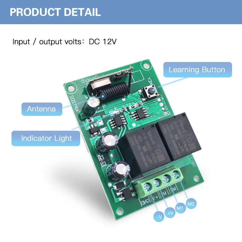 Рабочее напряжение: 12 В постоянного тока Ток покоя: <5 мА Максимальный ток: 10A Частота RF: 433 МГц Рабочая температура: -30 ~ + 80 Чувствительность приема: >97dbm Количество пульта дистанционного управления: 25 шт. Поддержка кодирования: код 1527/фиксированный код 2262 Режим работы RF: ASK superгетеродинный беспроводной прием Диапазон приема: открытое пространство более 50 метров Удаленный режим работы: Мгновенный режим/режим переключения