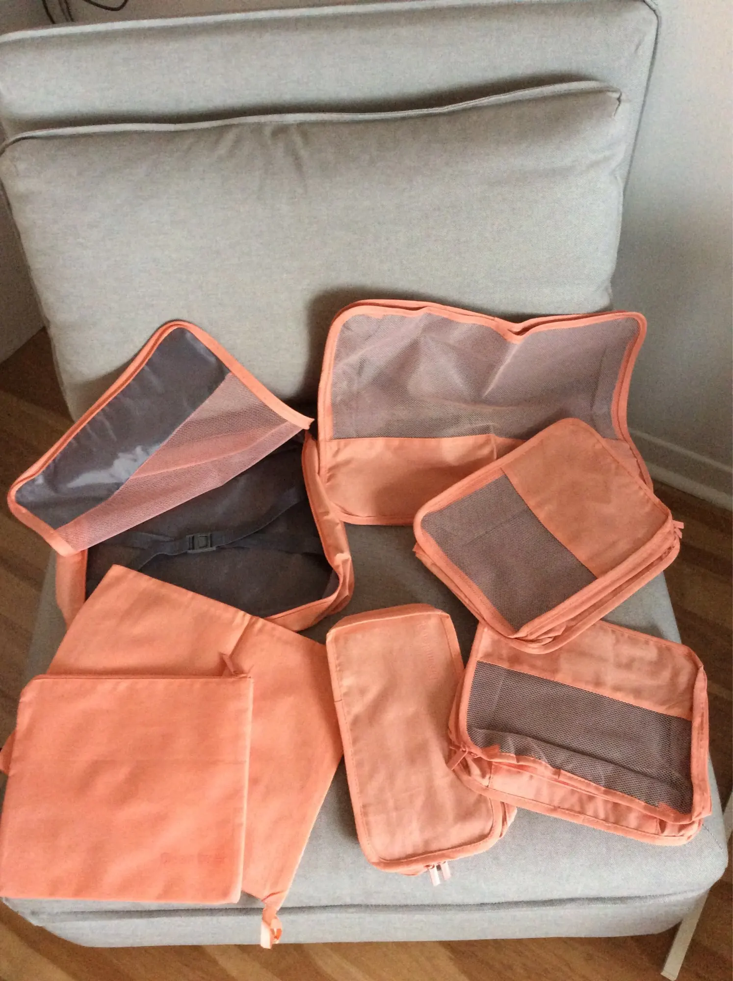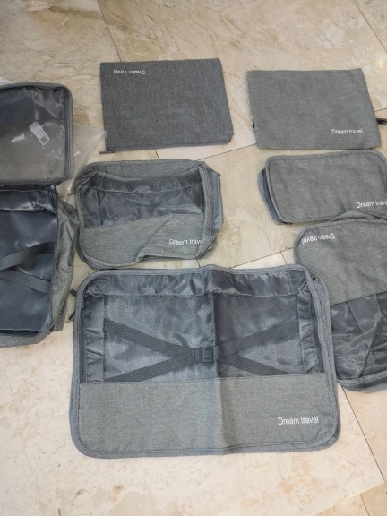 Набор пришёл за 3 недели. Хорошая ткань снаружи, внутри водоотталкивающая ткань, сетка крепко пришита, замочки хлипкие. Швы не все ровные, но терпимо. Поставила бы твёрдую четвёрку, но Сняла звезду за то что вместо 7 сумочек, мне пришло 6, а платила я за 7, не положили zip-pocket. На фото - все что положили в почтовый пакет