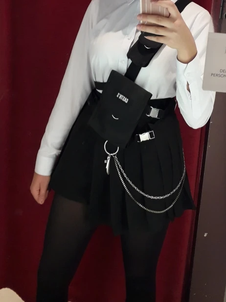 Я думал, что никогда в нем не поместится (Размер M), но это потому, что я не вижу молнии сбоку. Это была настоящая боль, потому что молния сильно застревает (даже когда она не на мне). Это действительно легко собрать все вместе, так что это хороший момент. Маленькая сумка и цепочка поставляются отдельно, поэтому вы можете надеть их на другую одежду, если хотите. В целом это отличный продукт. Вы должны гладить юбку, чтобы она выглядела лучше.
