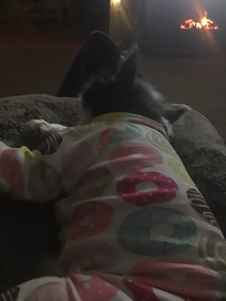 Сегодня собаня спала в этой пижаме! Спал как младенец! Удобно и тепло! Шерсти , главное меньше! Хлопок!