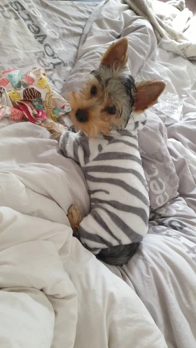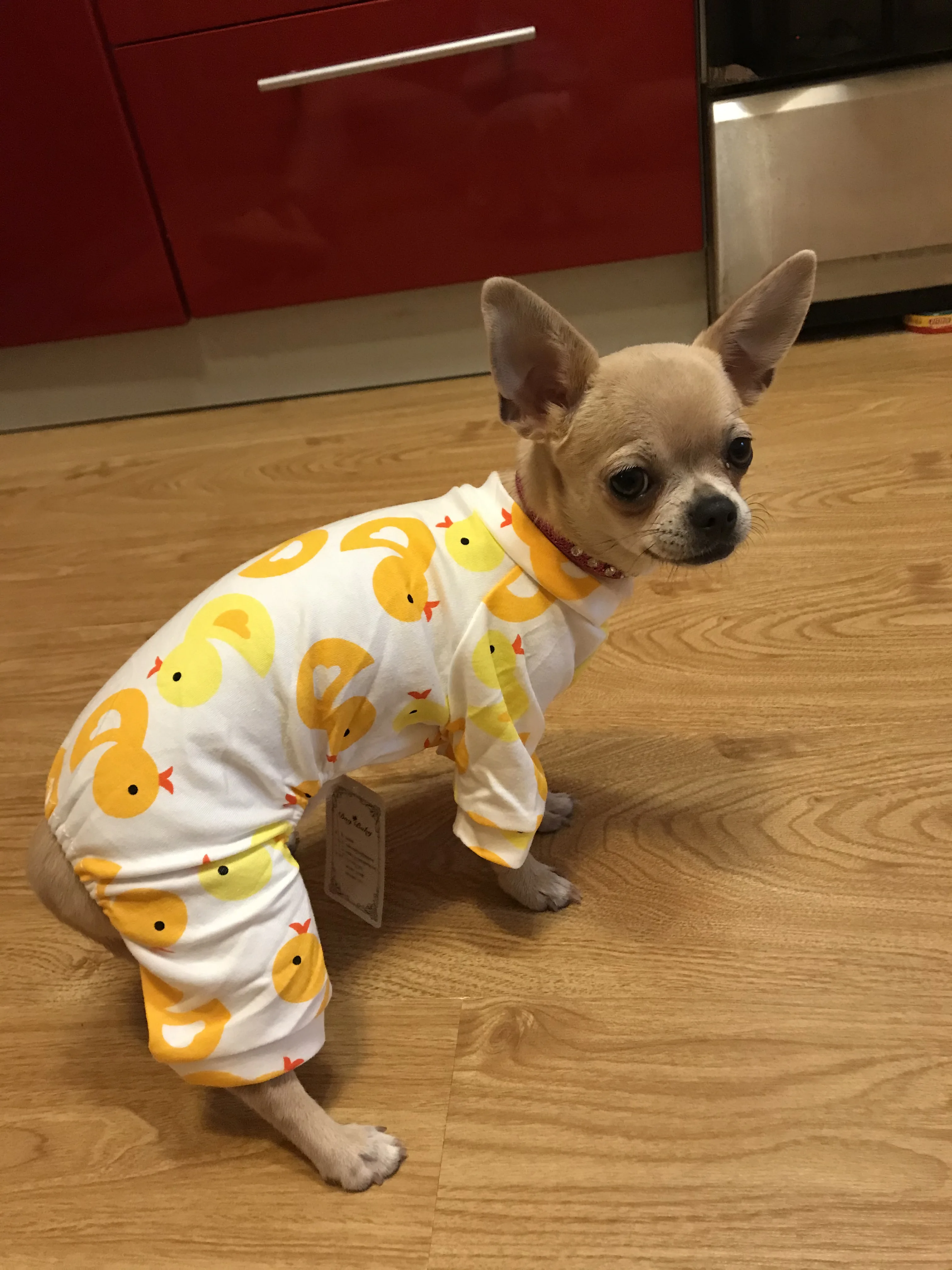 милейшая пижама, я заказалаXL на наш обычный l и угадала, сидит идеально на йорке, 3,7 кг