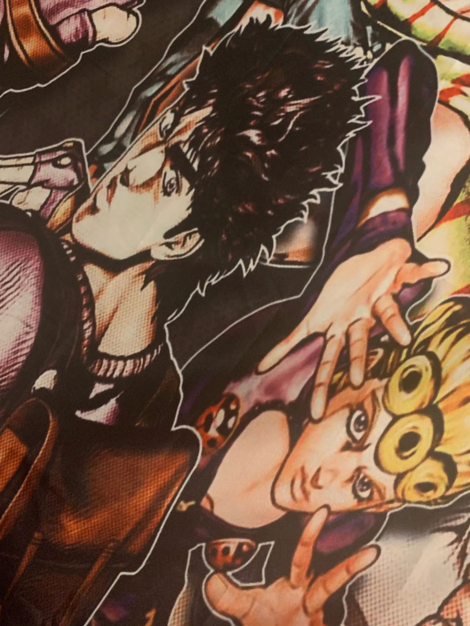 Мне нравится! Изображение немного размыто, но оно все еще отлично смотрится на стене. Качество довольно хорошее и солидное, и не было материала торчащего. Однотонный 9/10, рекомендуется. Теперь у меня есть все Jojos на моей стене lol. Спасибо!