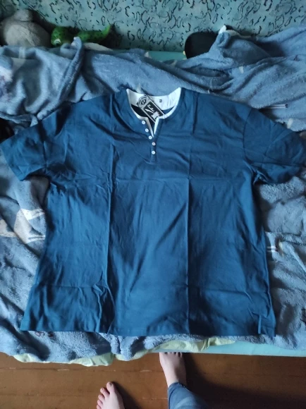 Надо учитывать, что фото сделано профессионально, в реале трикотаж выглядит дёшево и цвет не синий, размер точно по таблице продавца, отправили сразу, дошло быстро, а так изделие спасает только белый подворотничок. Подойдёт для домашней одежды.