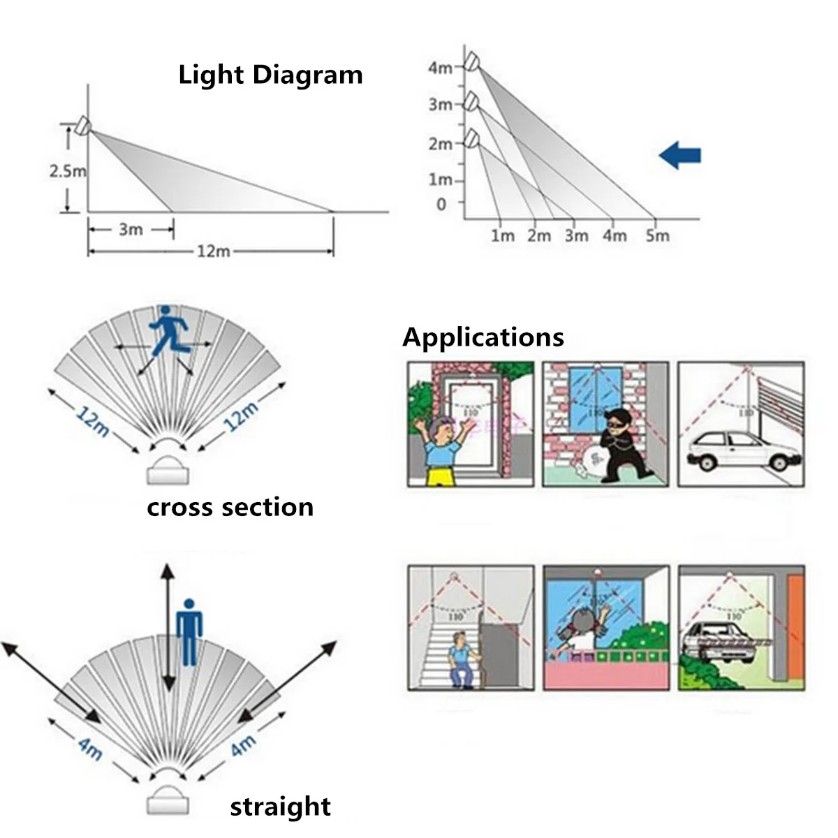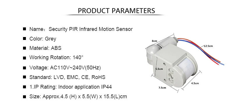 1. Цвет: серый2. Материал: АБС-пластик3. Рабочее вращение: 180 °4. Напряжение: 110 В ~ 240 В переменного тока (50 Гц)5. Стандарт: LVD, EMC, CE, RoHS6. Степень IP: применение в помещении IP447. Настройка Люкс: 0-люкс, регулировка svr8. Время индукционного освещения: 5s ~ 5 мин. регулируемое время9. Расстояние обнаружения: около 12 м, высота установки 1,5-2,5 м10. Выход: лампа накаливания максимум 100 Вт, флуоресцентная лампа 100 Вт, вытяжной вентилятор 100 Вт, двигатель 100 Вт, электрический звонок 100 Вт11. Размер: прибл. 5,5 (В) х 15,5 (Ш) х (Д) см