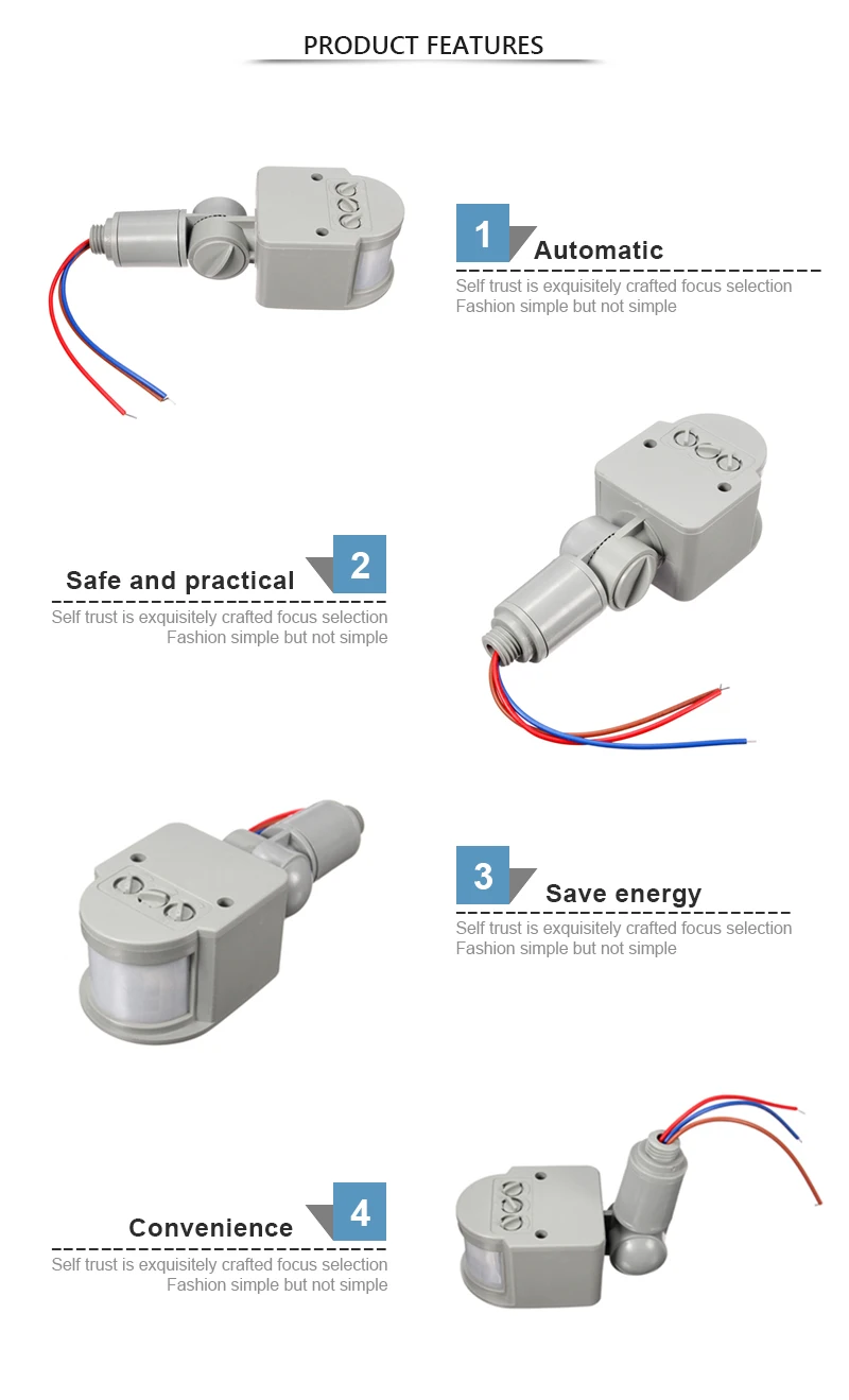 1. Легко установить3. Автоматический, удобный, безопасный и практичный.4. Индикация мощности и обнаружения.5. Датчик движения может автоматически определять день и ночь.6. Широкий диапазон обнаружения: состоит из полей обслуживания вверх и вниз, влево и вправо.7. В качестве источников управляющего сигнала используются инфракрасные лучи движения человека. Когда человек попадает в поле обнаружения, он сразу начнет управляемую нагрузку.
