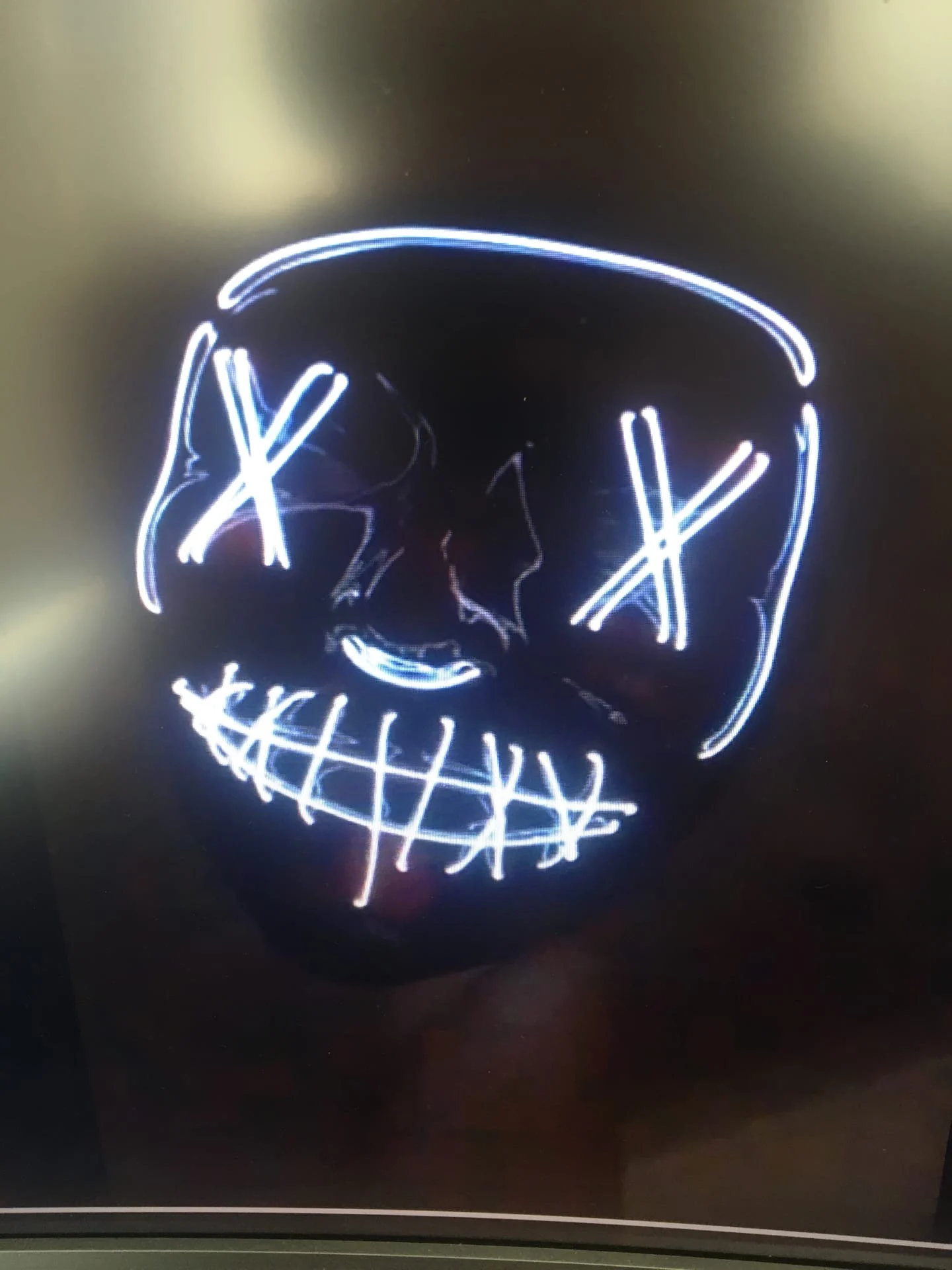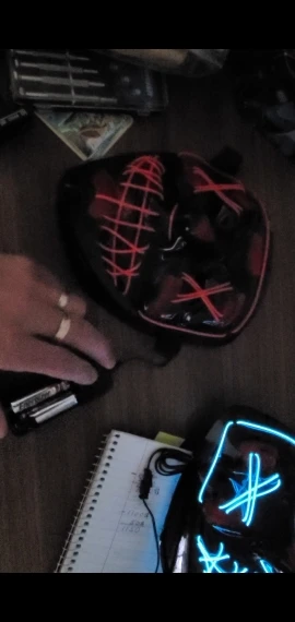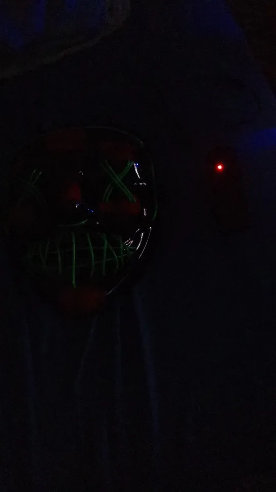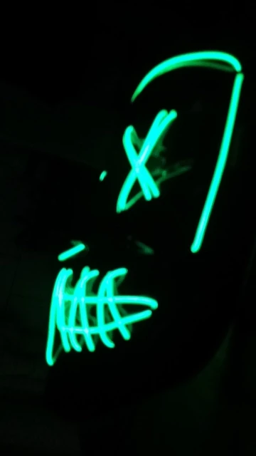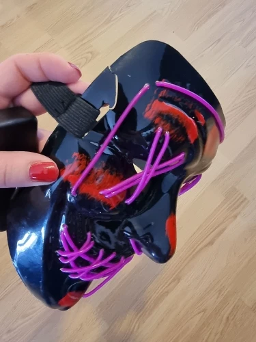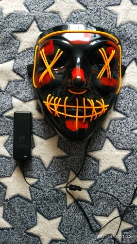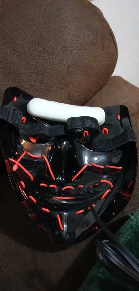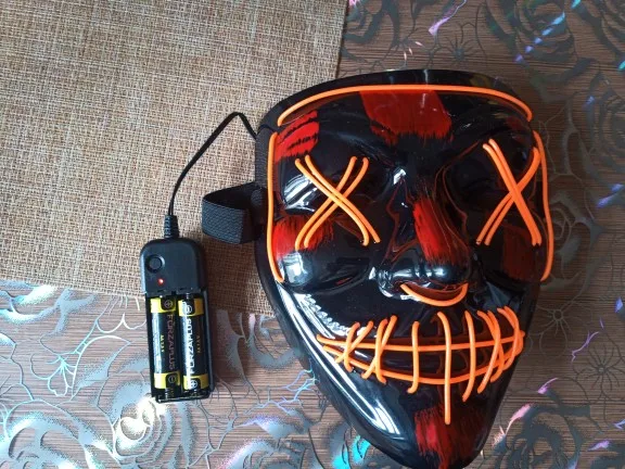 Маска обычная пластиковая тонкая и на нее намотана гирлянда с батарейками.
