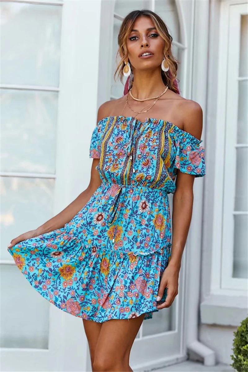 Винтажное шикарное женское платье с открытыми плечами и цветочным принтом, женское платье мини из искусственного хлопка с коротким рукавом в стиле бохо, платья
