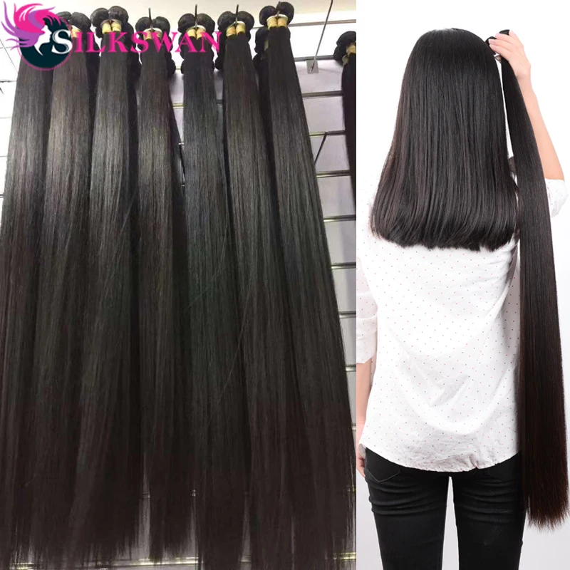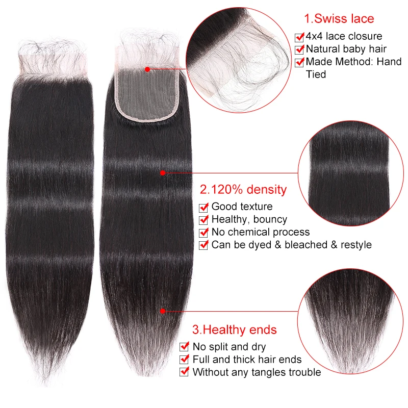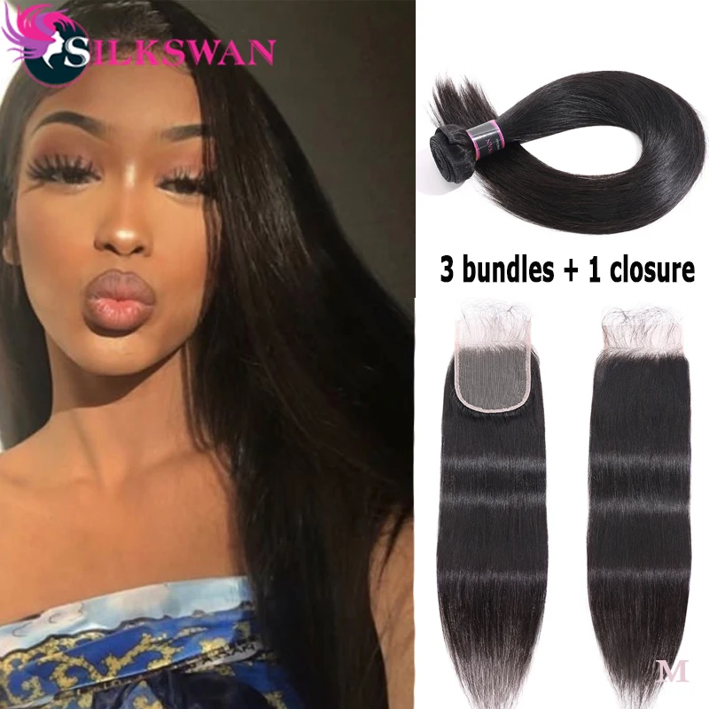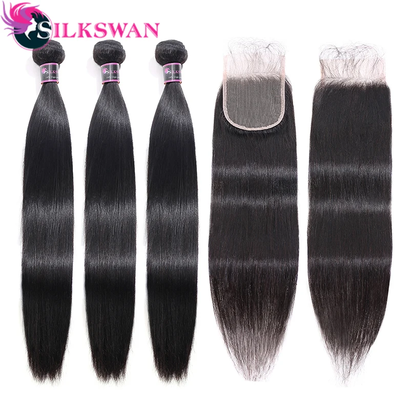 Silkswan прямые человеческие волосы, пучки с закрытием, бразильские волосы для наращивания, 4x4, швейцарское кружево, 4 шт.лот, Remy волосы для женщин