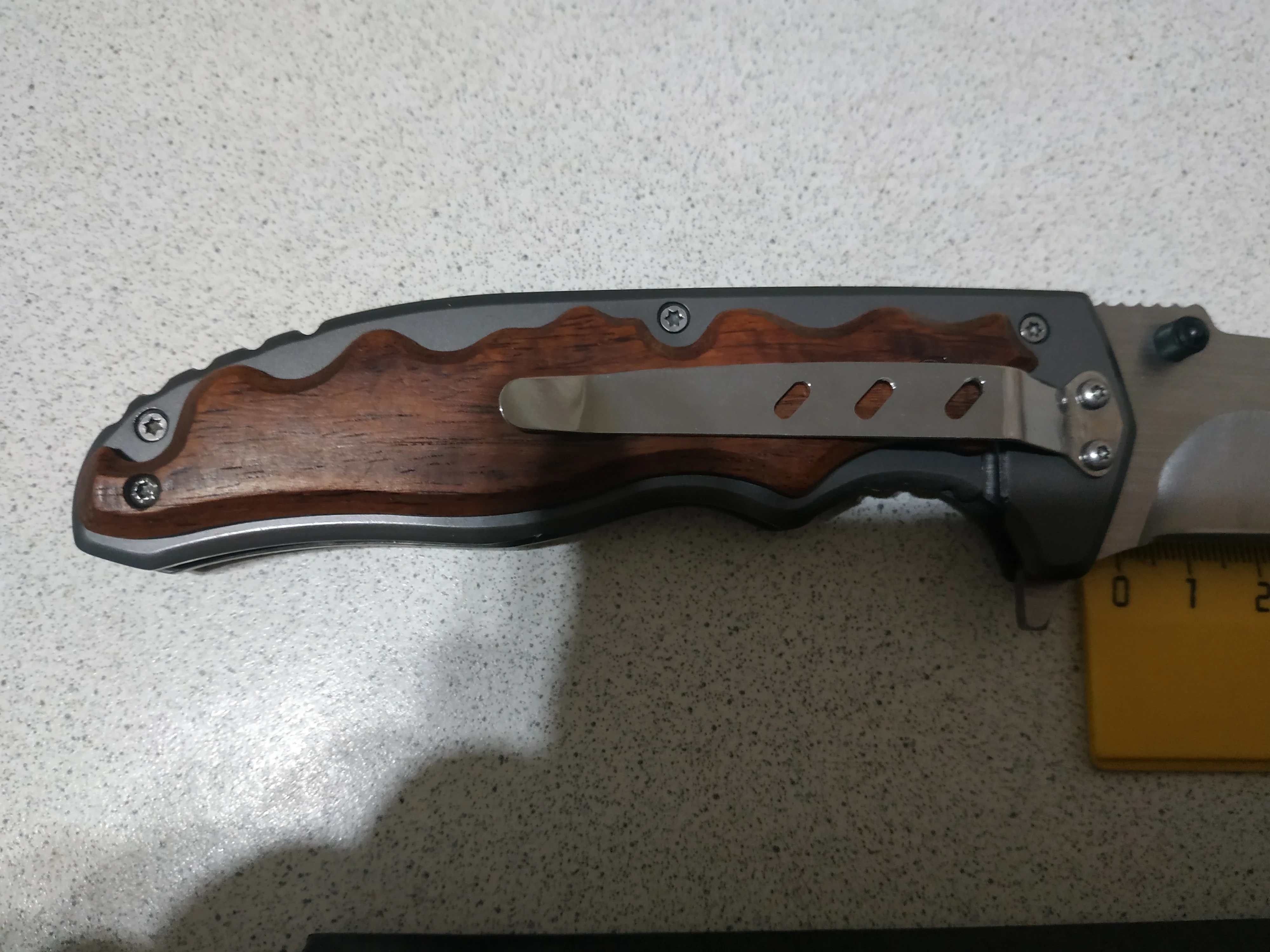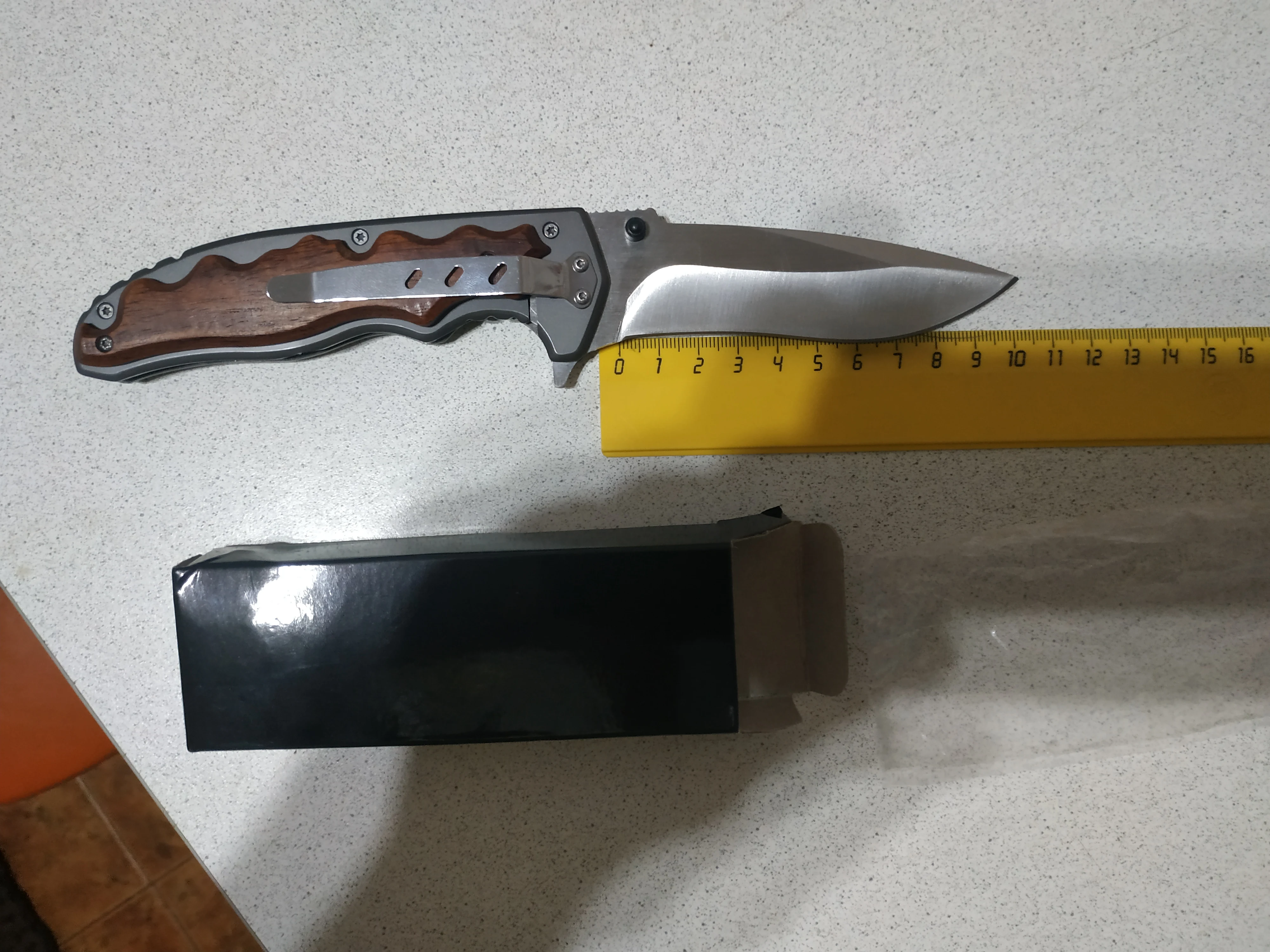 Размеры соответствуют описанию. Пришел в смазке. Не флипует, может разработается. Сведение тонкое около 0,5 мм. Заточен хорошо - бреет волосы.Удобно сидит в руке. Брал по акции за 8,7$, своих денег стоит. Пришел через СДЕК.