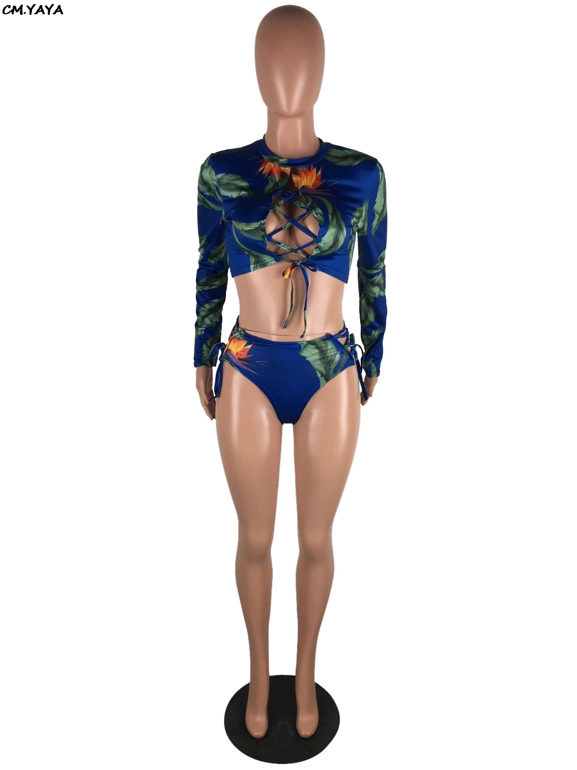 Женское пляжное боди с цветочным принтом, на шнуровке, с длинным рукавом спереди, укороченный топ и трусики, комплект из 2 предметов, спортивный костюм, S6121, 2019