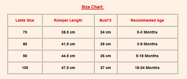 Свободный размер Длина комбинезона Бюст * 2 Рекомендуемый возраст 70 38,5 см 24 см 0-3 месяца 80 41,5 см 25 см 3-9 месяцев 90 44,5 см 26 см 9-18 месяцев 100 47,5 см 27 см 18-24 месяцевРазница в 2-3% в соответствии с измерениями вручную. Прежде чем купить эту товарную позицию, просим тщательно свериться с таблицей размеров. 1 дюйм = 2,54 см