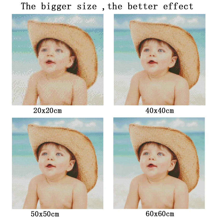 Чем больше размер, тем лучше эффект! Каждый размер алмаза: 2.5x2.5мм. Если изображение сложное, маленький размер будет не очень подходящим! Если вам нужен большой размер любых фотографий, пожалуйста, свяжитесь с нами!