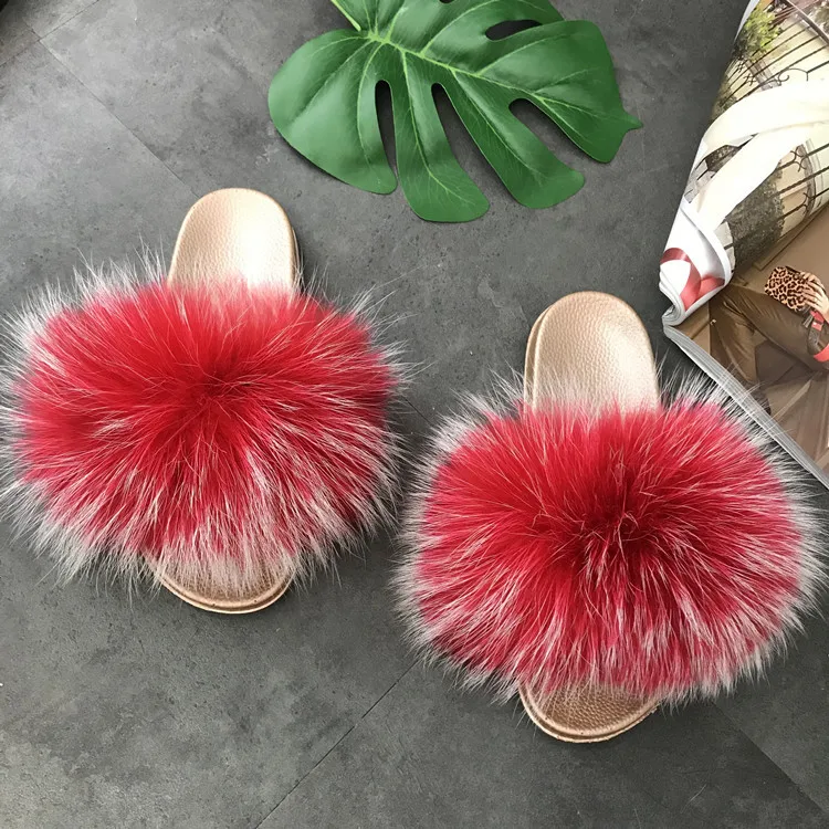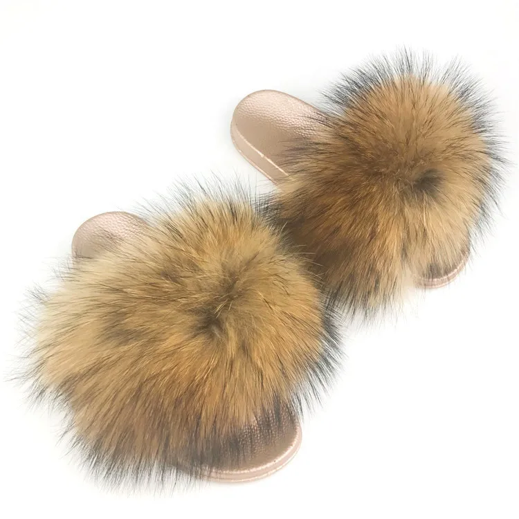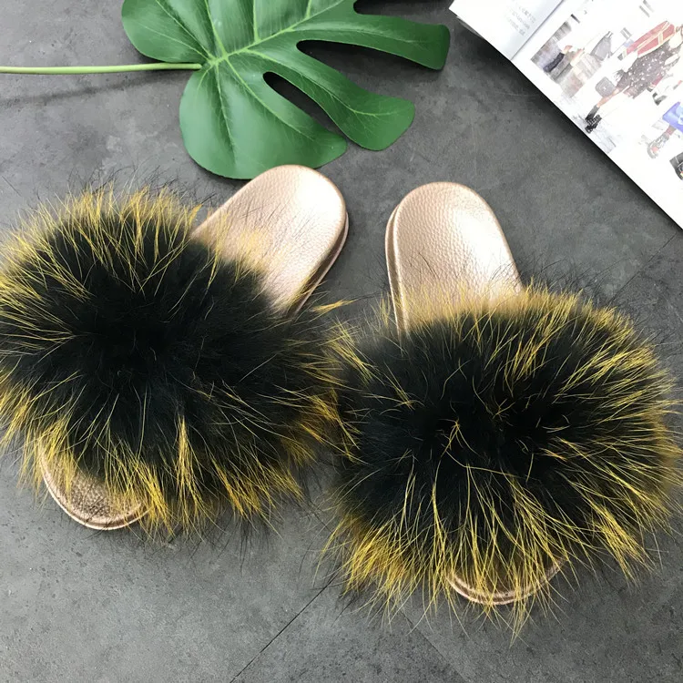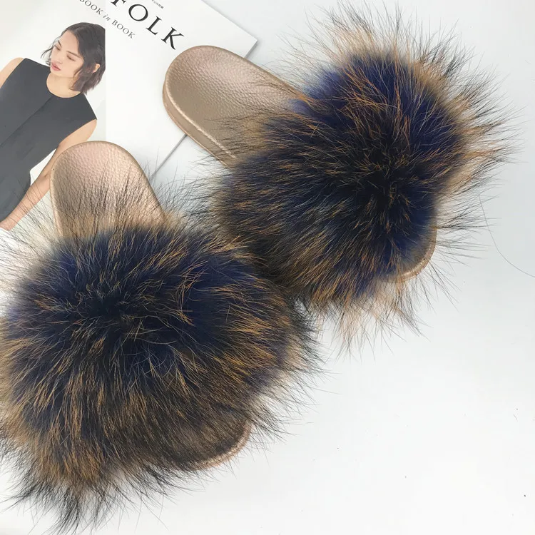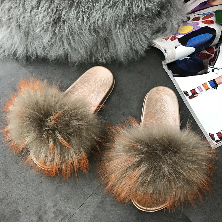 Женские сандалии из натурального меха енота, босоножки больших размеров с натуральным мехом лисы и пушистым мехом, обувь на плоской подошве для лета, 2019