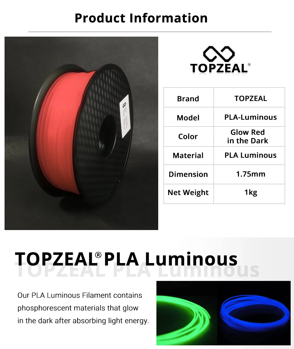 Topzeal 3D-принтеры PLA световая Цвет нити, возможна погрешность +/-0,05 мм, 1 кг катушку, 1,75 мм, свечение красного цвета Цвет в темное время суток