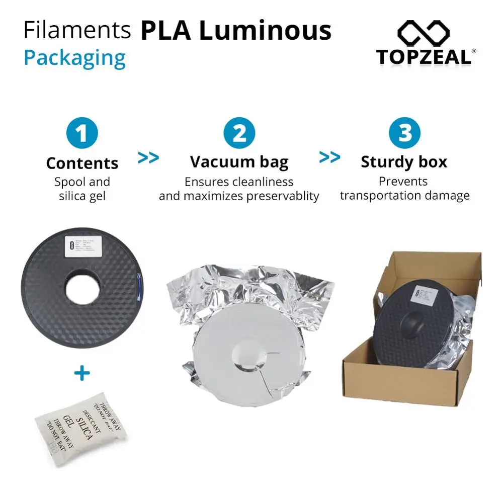 PLA светящаяся цветная нить содержит фосфоресцирующие материалы, которые светится в темноте после поглощения энергии на светильник. Эти дополнительные материалы позволяют нитям светится в темноте в течение определенного периода после того, как светильник подвергается воздействию. Светящийся эффект сильнее при воздействии на УФ-светильник.