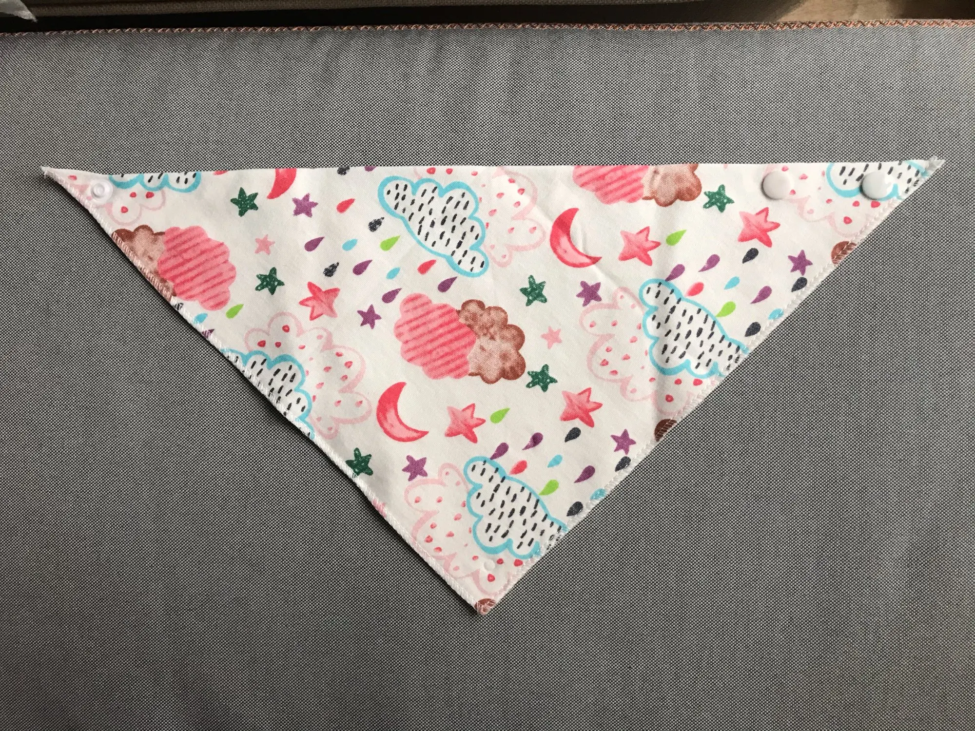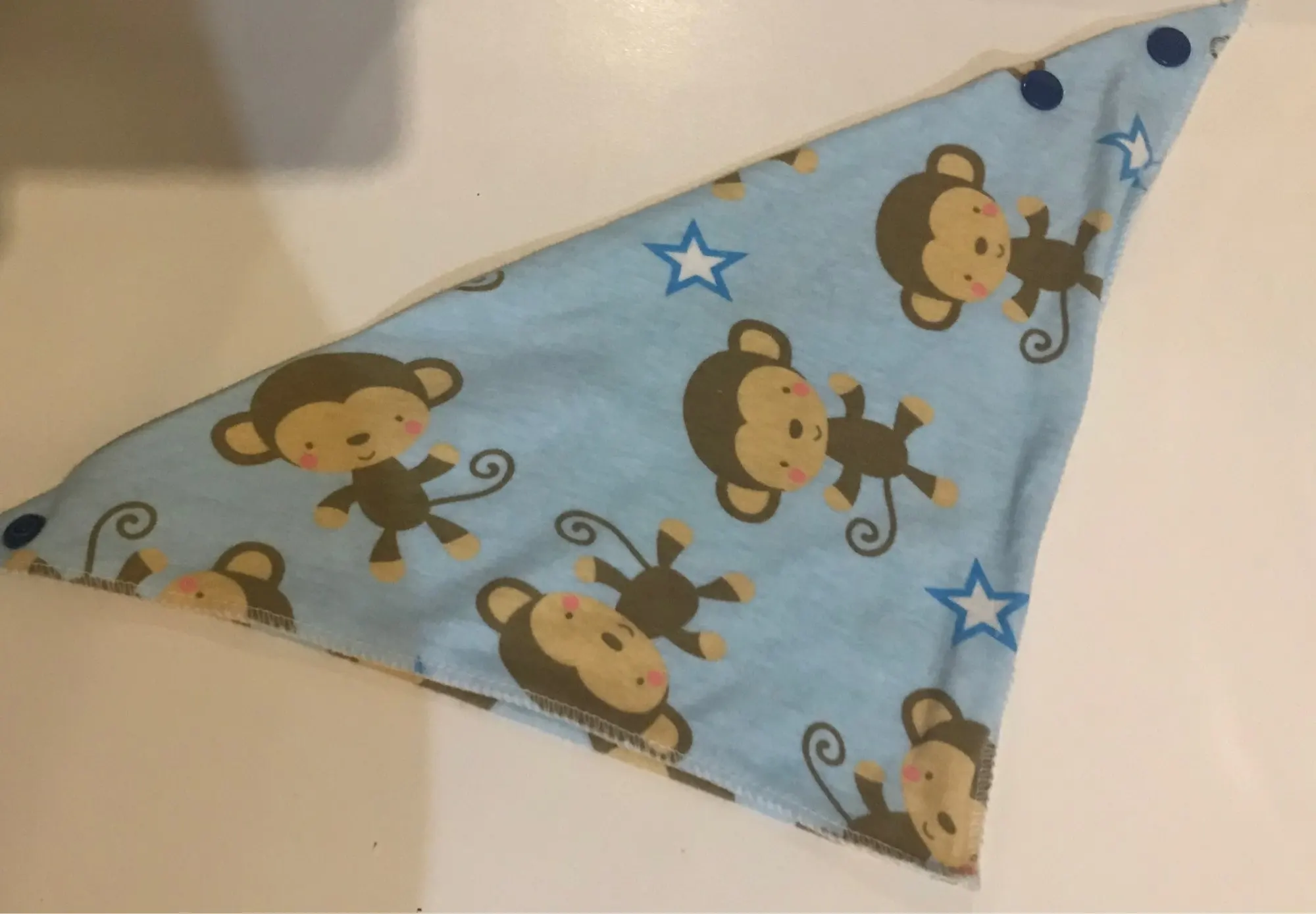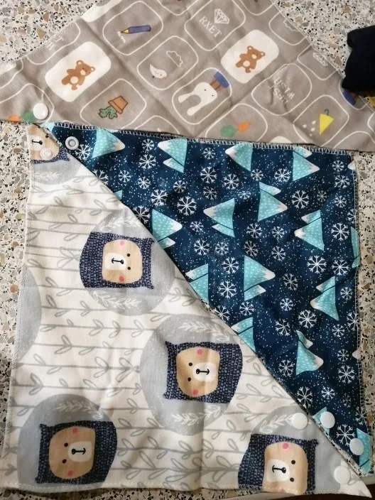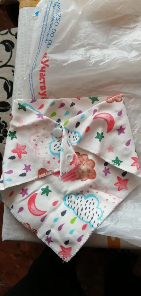 Слюнявик классный. Нравится что можно регулировать объем захвата на шее при помощи двух кнопок. Ткакь плотная, за счёт чего промокает не сразу.
