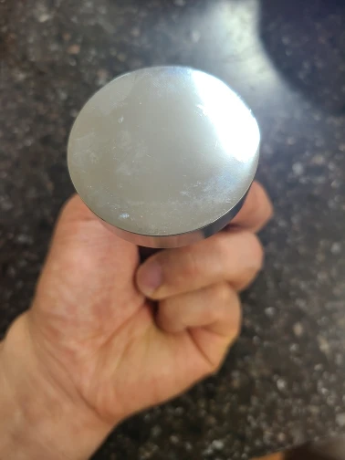 Хороший темпер. В диаметре, по-моему, на 0.5 мм меньше (штангенциркулем не мерил). И поверхность не идеально гладкая, а с мелкими шероховатостями (зазубринками). Но не так, чтобы прям кожу режет - в целом гладкая. Главное - функционал свой выполняет, кофе прессует. Своих денег стоит.