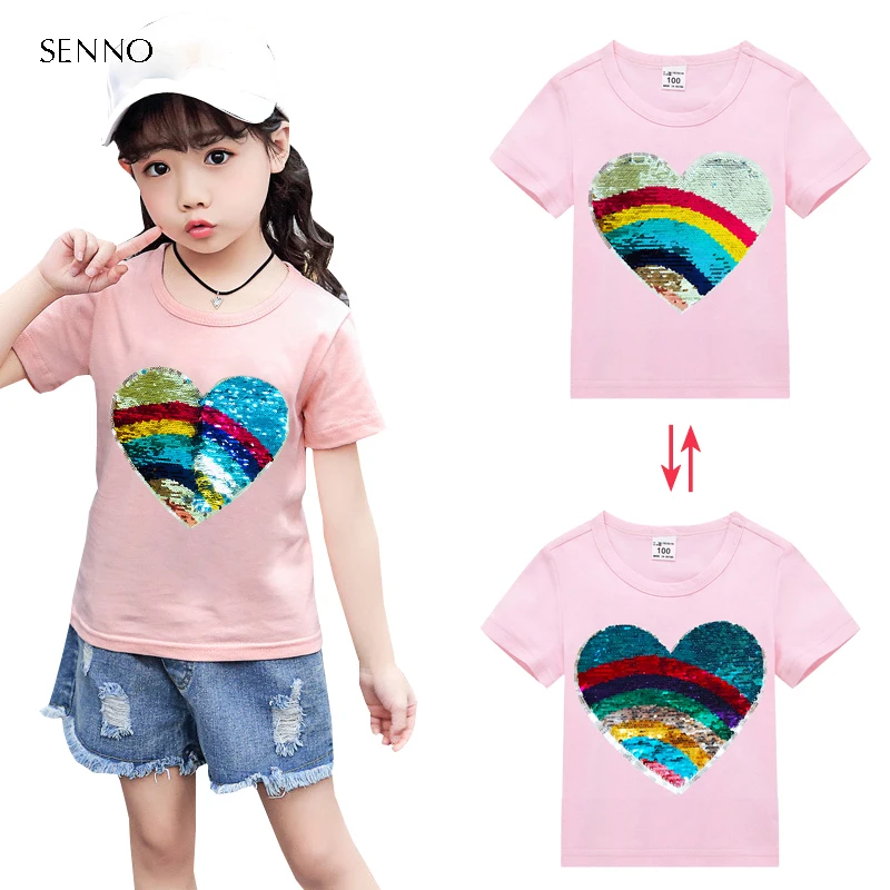 Двусторонняя Футболка с блестками для девочек, летний топ с коротким рукавом для девочек, футболки с принцессой, детская одежда для малышей, От 2 до 12 лет