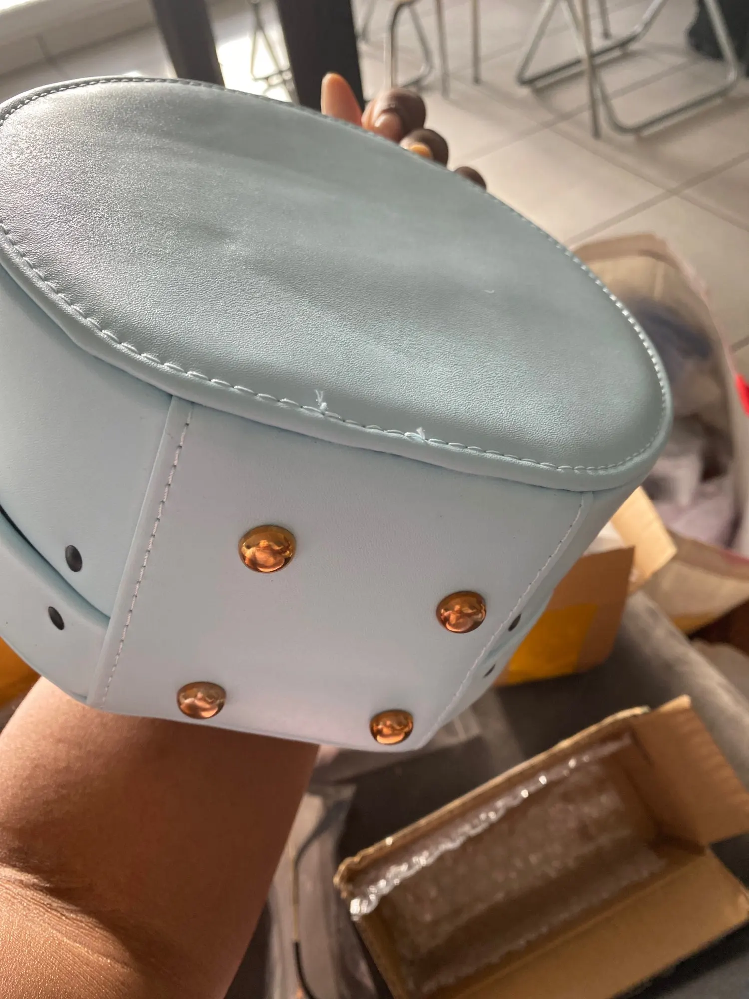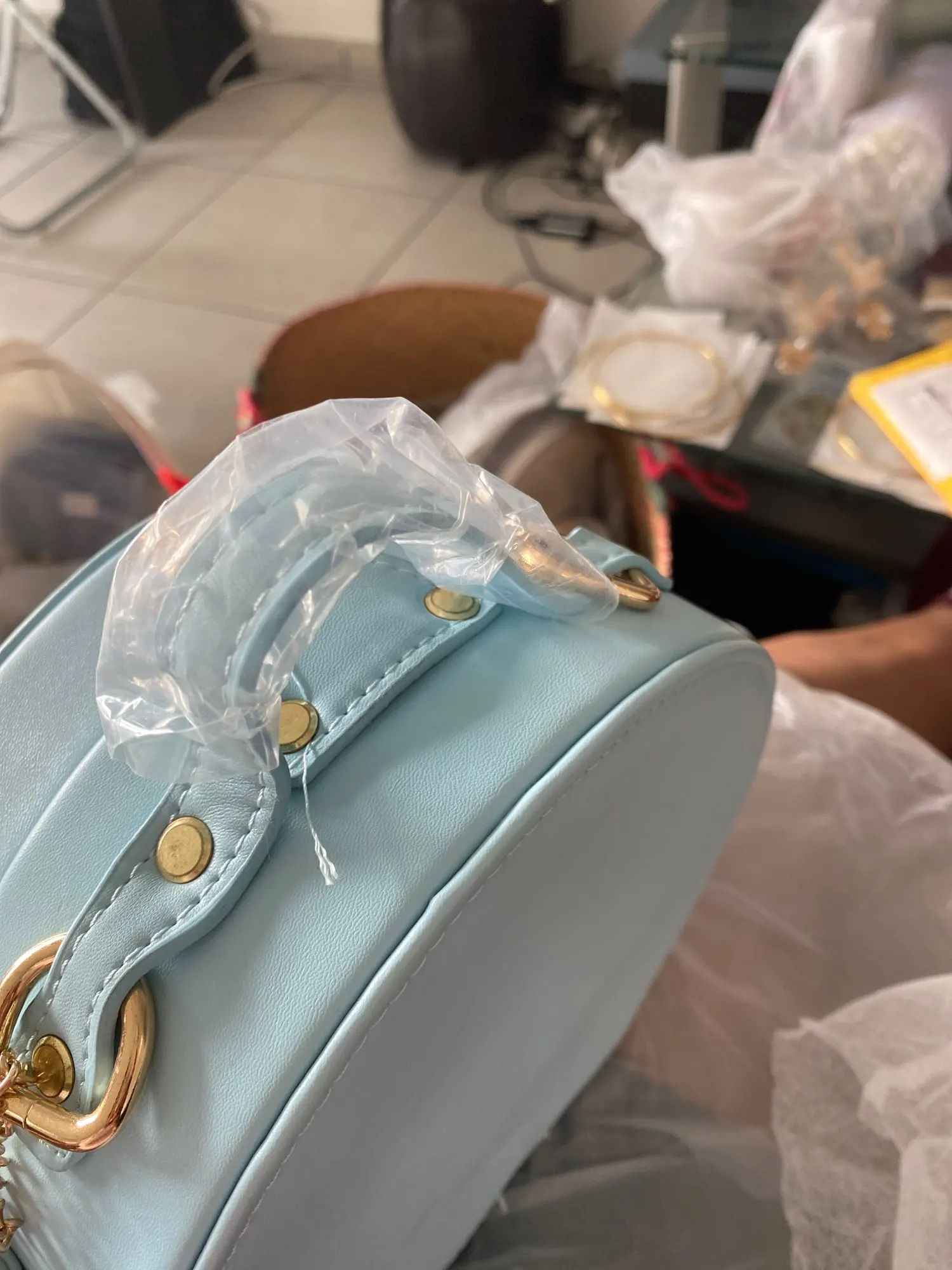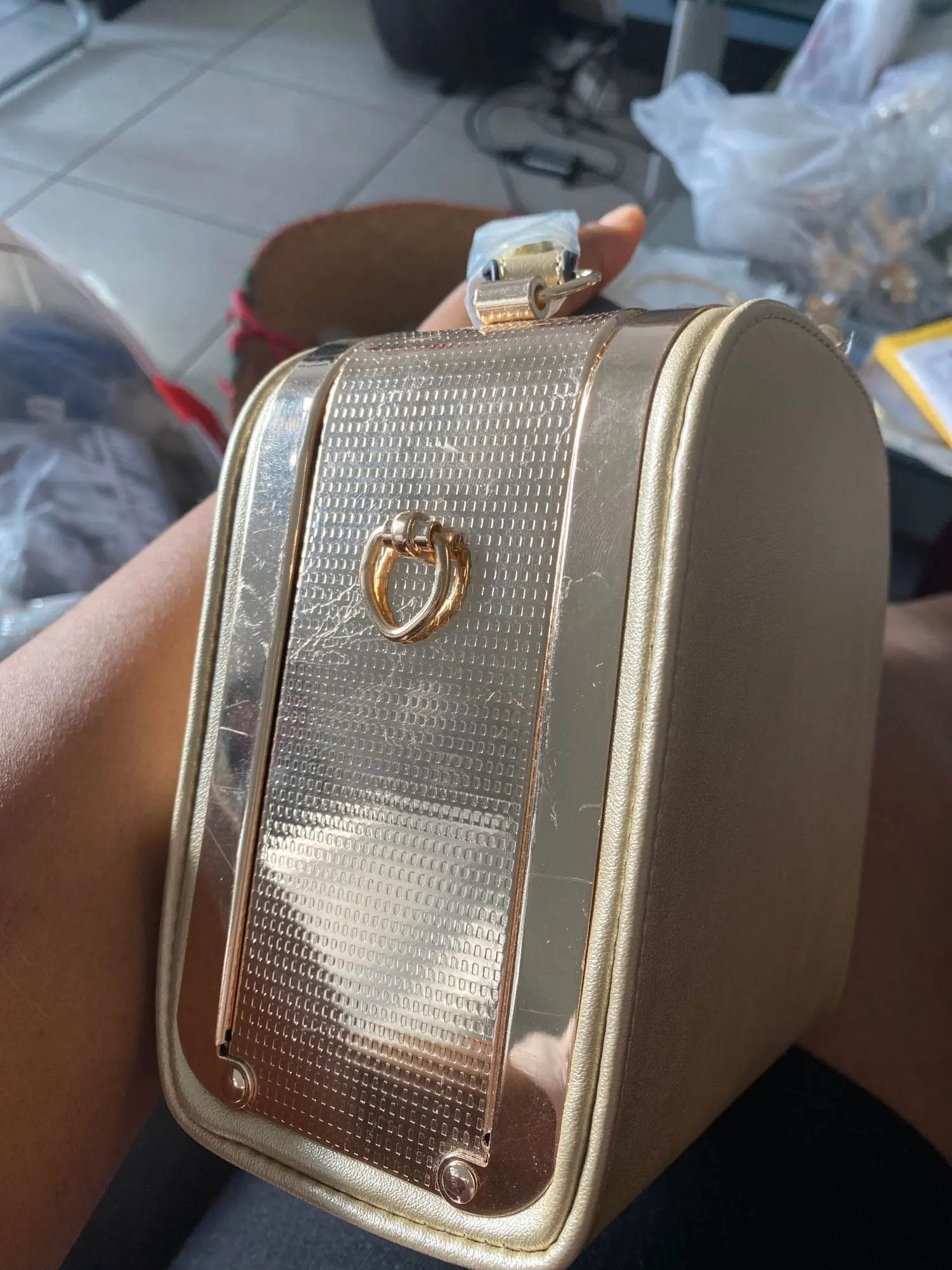 Эта сумка такая милая, но, к сожалению, она была повреждена, и она также имеет сильный запах.