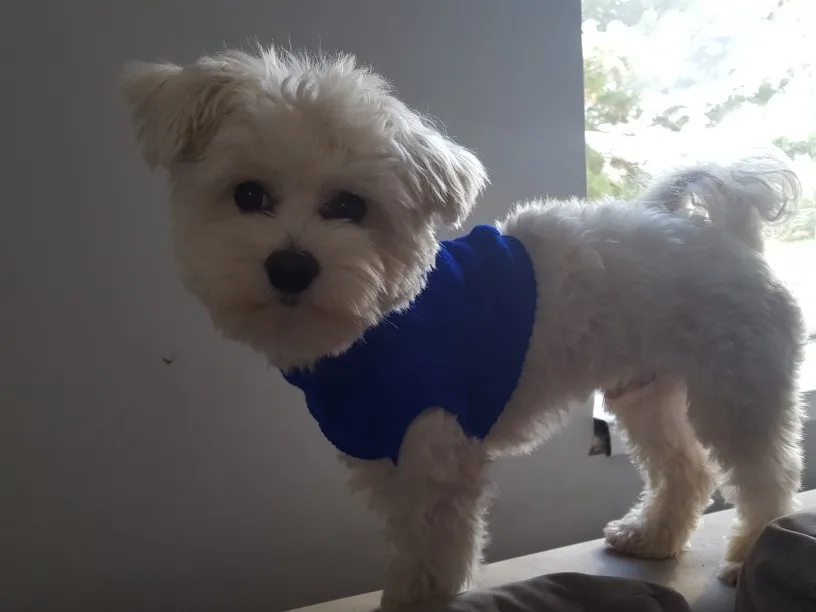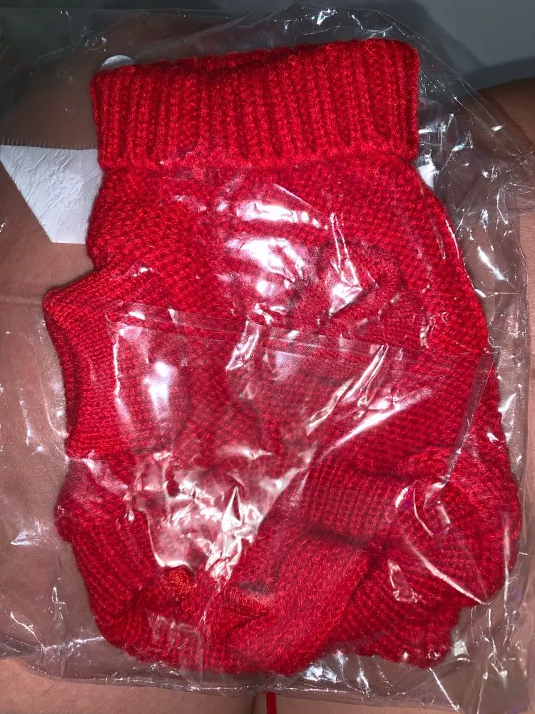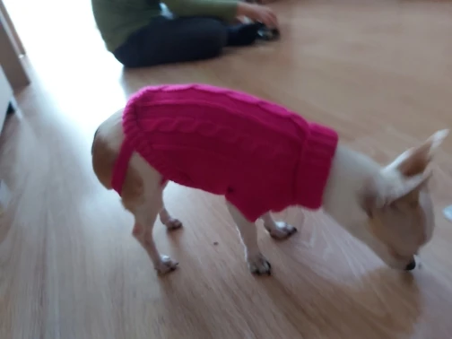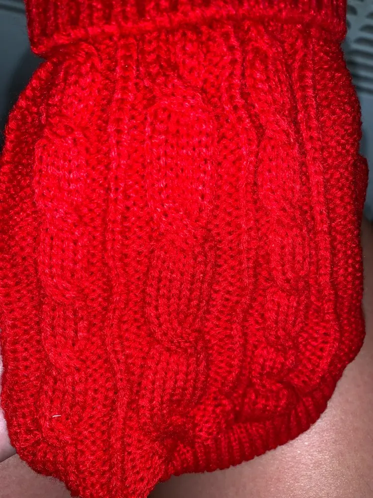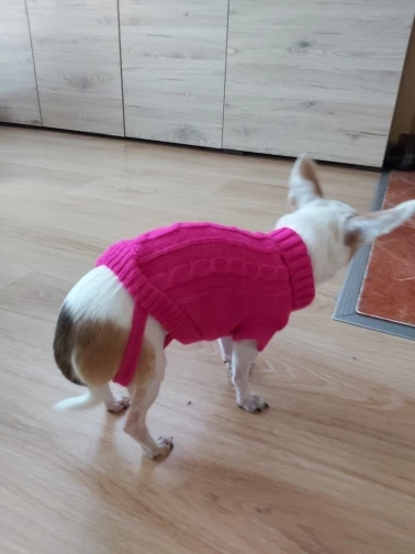 Очень хороший свитер, хорошо сел и за счёт верёвочек для задних лап хорошо держится и не спадает.