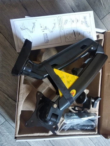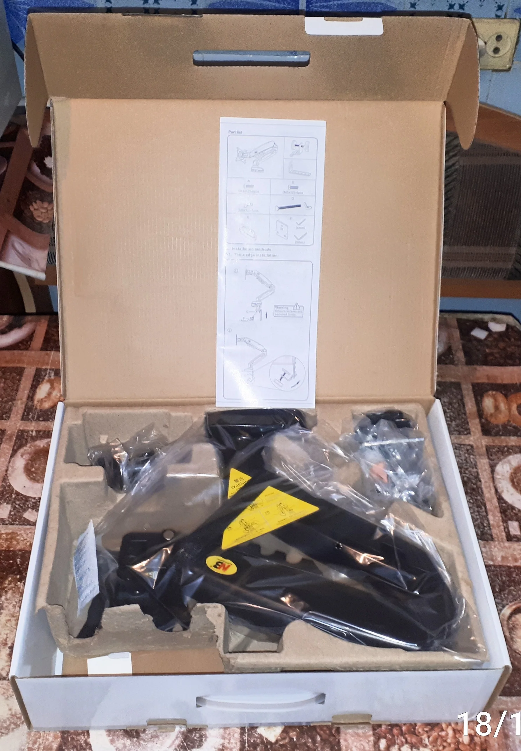 Быстрая доставка, Хорошо упаковано в фирменную коробку с ручкой и картинкой держателя. Установил широкий монитор LG 29" После регулировки газовой пружины держатель фиксируется в любом положении без колебаний.