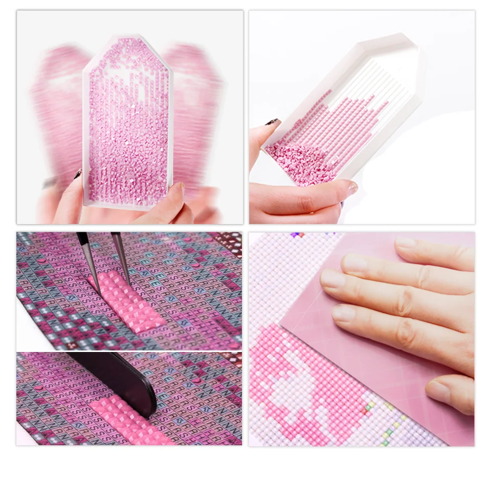 Инструменты включают в себя: алмазную пластину, клей, пинцет, ручки (наклеить 10 бриллиантов одновременно)