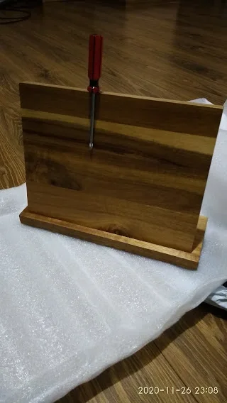 Отримано швидко - три тижні до Одеси. Легко і зручно зібрати. В комплекті продавець додав викрутку. Упаковано файно, дошка ціла без відколів. Виглядає красиво і стильно, мені подобається. Але є одне АЛЕ - магніт слабкий, особисто за для ножів 7 та 8 дюймів які в мене важкі зі сталі.