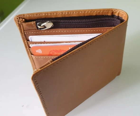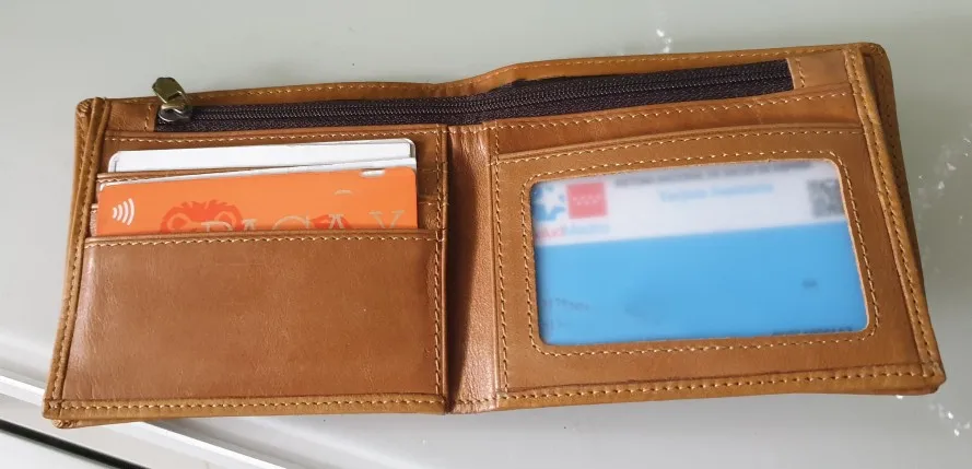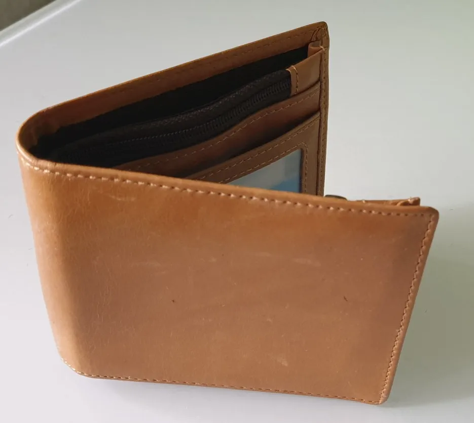 Все согласно фото и описания.Кошелек тонкий и мягкий.С деньгами и карточками получится не очень толстый.Для карточек можно использовать до шести отделений.Два отделения для купюр и одно отделение на молнии.Цвет рыжий но при искуственном освещении может принимать цвет болотной высохшей травы.Кошелек без застежки но это на любителя.Продавца рекомендую.