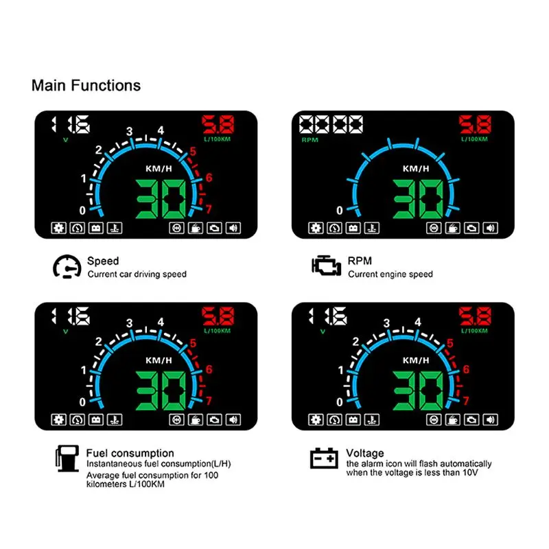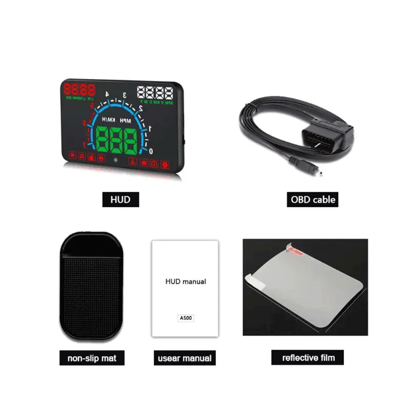 HUD короткий для дисплея головы вверх. Он отображает данные о вождении на лобовом стекле, такие как скорость, об/мин, расход топлива, температура воды, напряжение; Избегайте вождения становятся опасными из-за просмотра инструмента во время вождения.