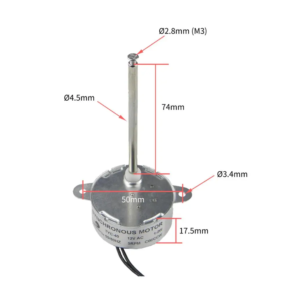 Название продукта: Синхронный двигатель; Модель: TYC-40; Скорость: 5 об/мин; Вал Диаметр: 4,5 мм; Длина вала: 74 мм; Внутренний Диаметр резьбового вала: М3, (Φ2.8мм); Диаметр монтажного отверстия: M4 (φ3.4мм); Направление: CW/CCW(UNCONTROLLAB); Крутящий момент: ≤ 0,5 кг * см; Частота: 50/ 60 Гц;