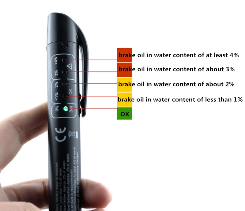 Характеристики: предназначен для простой проверки качества торможения. 5 светодиодов, чтобы указать процент воды в тормозной жидкости. Автоматическое отключение питания. Небольшой и светильник для большего удобства. Отличный помощник для вашего путешествия. Параметры: Тип: Тормозная жидкость тестер Материал: светильник светодиод Количество: купальное полотенце, 1 шт товара Цвет: Черный Совместимость с: мобильными телефонами всех транспортных средств Батарея: 1 * LR03 AAA 1,5 V Батарея (не прилагаются) Размеры; 15*2,5 см чистая Вес: 0,04 кг