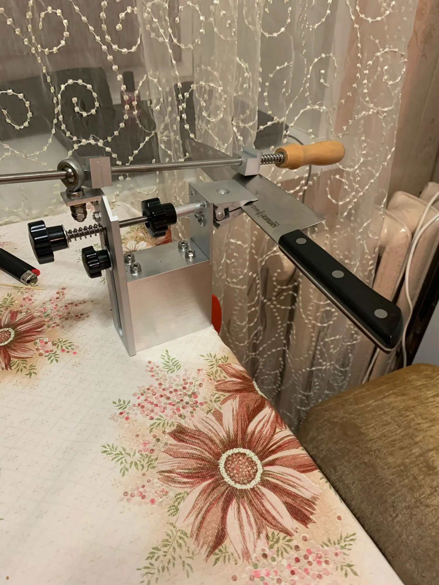 Точилка огонь. Добавил три гайки, две для распорки, чтоб не разгибались параллельные пластины при затягивании, одну на штангу, законтрогаил гайку, чтоб не раскручивалась. Продавец отправил быстро, хорошо упаковано. Дошло за 10 дней. Товар рекомендую.