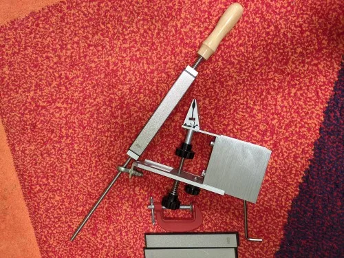 Точилка хорошая. Взял алмазные бруски. Самое мелкое зерно 1000 до гладкой поверхности не выводит. Нужно докупать более мелкое или наждачку крепить к бруску, зажим позволяет.